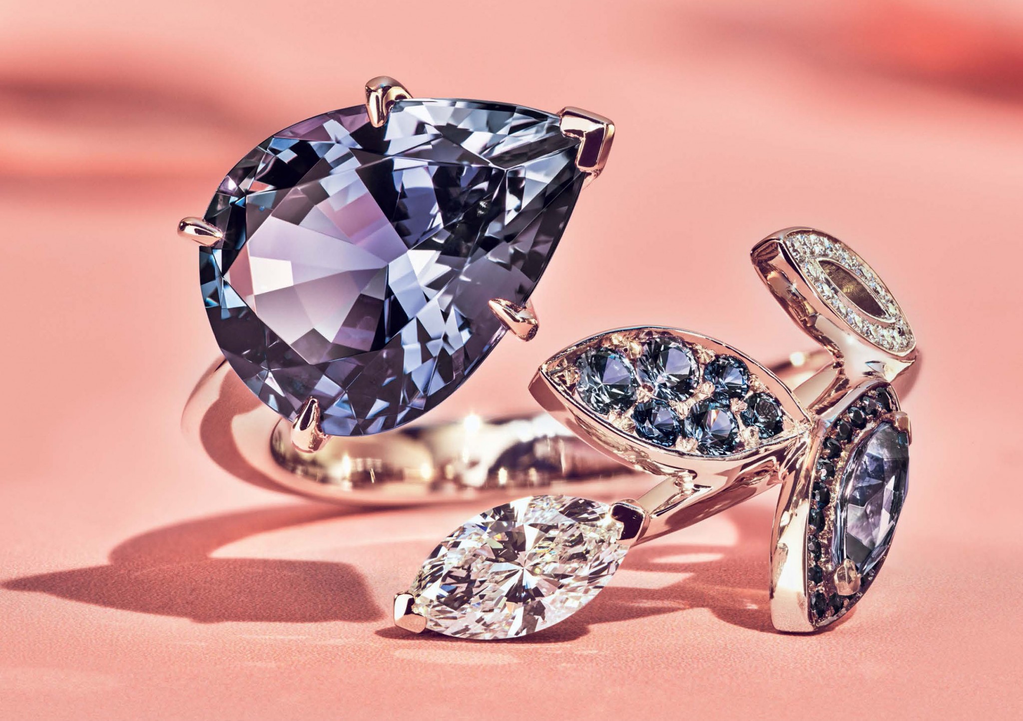 Кольцо из серии Autumn, платина, танзаниты огранки «груша» и «маркиз» общим весом более четырёх каратов, сапфиры круглой огранки, бесцветные бриллианты