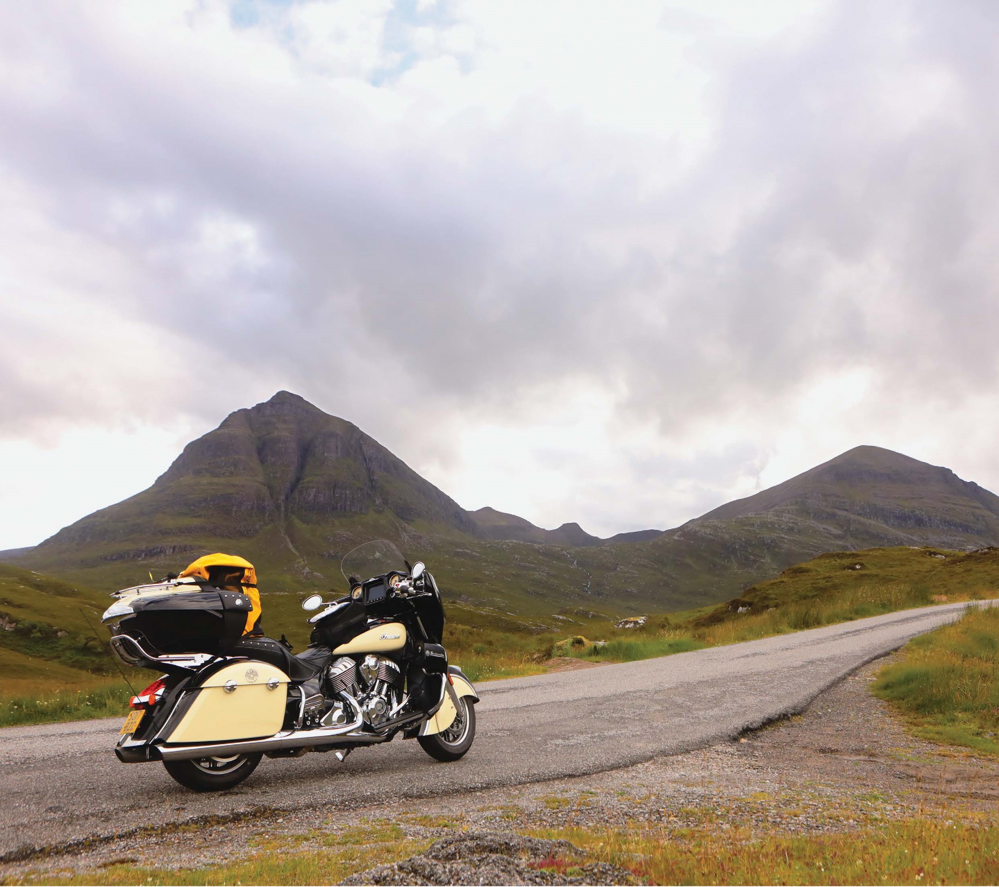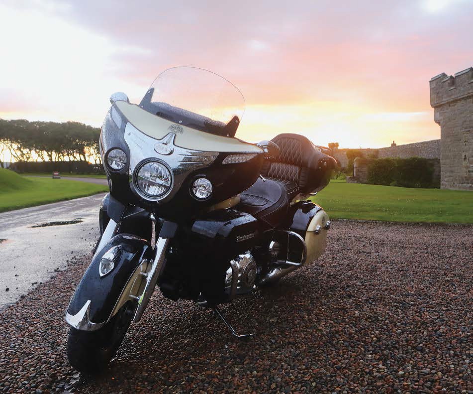 Извилистая дорога протяжённостью 500 миль (чуть более 800 км), начинаясь и заканчиваясь в Инвернессе, проходит по северной оконечности Великобритании. Маршрут, учреждённый в 2014 году некоммерческой организацией North Highland Initiative под патронатом принца Чарльза, успел стать легендарным: тут и живописные пейзажи, и виражи, от которых голова идёт кругом. Нигде на Британских островах поездка на байке не будет такой захватывающей, как здесь. В 2015 году я уже гонял на «Роадмастере» по Южной Африке, так что был вполне уверен, что этой мощной машине под силу одолеть крутизну склонов и зигзаги однополосных дорог на маршруте NC500. Из доработок у моего байка — новая телематика Ride Command c 7-дюймовым интерфейсом и тачскрином, но особенно я горжусь винтажным дизайном — он как раз подходит к моему плану посетить лучшие исторические отели Шотландии. Я заказал новый «Роадмастер» у дилера Saltire Motorcycles в Эдинбурге и вскоре покинул этот город, направившись в Инвернесс. Не провёл я и пяти минут в дороге, как слева довольно близко от меня показался олень. Я нёсся по трассе, скользкой от вчерашнего дождя, мимо густорастущих сосен, и олень, внезапно уклонившись вправо, оказался прямо передо мной. Я дёрнул тормозной рычаг, и животное в панике упало на землю, беспомощно перебирая копытами. А я в полной мере оценил антиблокировочную систему Indian.