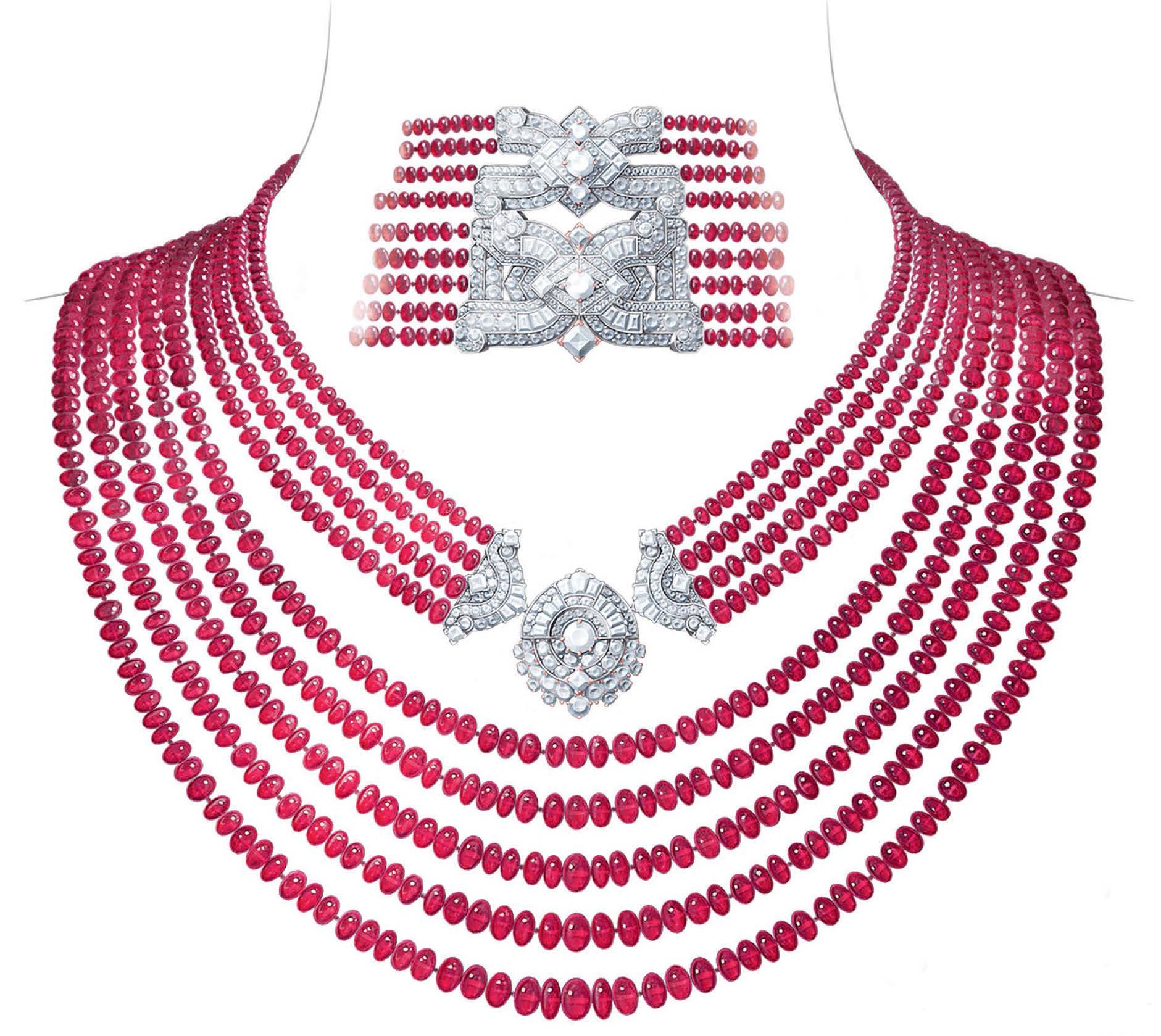 В 2016 году объединяющим элементом в коллекции Émeraude en Majesté служил изумруд, сейчас красной (в прямом смысле слова) нитью, проходящей через все украшения, стал рубин. Крупный красный корунд — большая редкость и огромная ценность. Тем удивительнее, как удалось геммологам Van Cleef & Arpels собрать столько великолепных «камней с характером». Ошеломляющими цифрами поделился глава компании