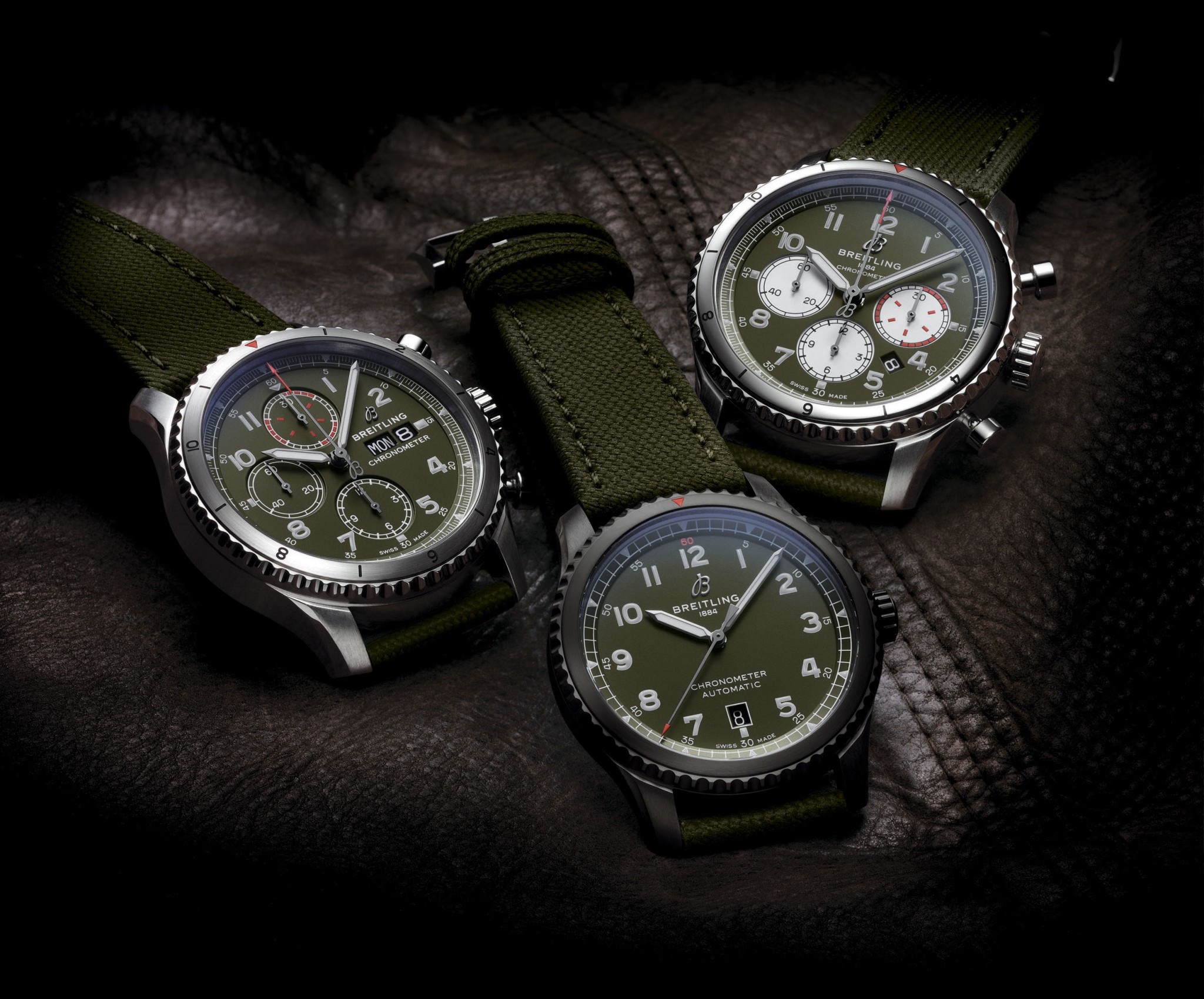 Положение «пилотской марки №1» обязывает Breitling углублённо изучать мировое авиационное наследие. Ревизуя его, часовой производитель натолкнулся на истребитель P-40 Warhawk. Американская компания Curtiss-Wright (между прочим, прямая наследница предприятия, основанного пионерами авиации братьями Райт) массово выпускала его в годы Второй мировой и даже поставляла в СССР по ленд-лизу. Окрашенные в цвет хаки циферблаты и ремешки трёх моделей обыгрывают боевое прошлое крылатой машины. В серии Aviator 8 Curtiss Warhawk дебютируют (на фото — по часовой стрелке) хронограф c мануфактурным калибром B01, трёхстрелочник с механизмом Breitling 17 (базовый калибр ETA 2824) и хронограф, оснащённый механизмом Breitling 13 (база — ETA/Valjoux 7750). По традиции марки, все механизмы сертифицированы COSC в качестве особо точных часов (хронометров). Оба хронографа помещены в стальные корпуса диаметром 43 мм, а стальной корпус трёхстрелочника имеет диаметр 41 мм и отличается тёмным углеродным покрытием DLC. На задние крышки (с сапфировым стеклом у хронографа с мануфактурным калибром и глухие у двух других моделей) нанесены изображения истребителя P-40 и надпись Curtiss.