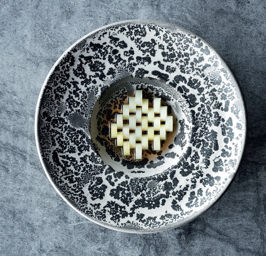 Обед в ресторане Amass начинается неожиданно, хотя посетитель уже готов к сюрпризам. Углубившись в промзону на окраине Копенгагена, вы оказываетесь за столиком в здании бывшей судоверфи с голыми бетонными стенами, покрытыми граффити. Интерьер выглядит брутально, но солидно благодаря кожаным креслам и столикам из морёного дуба. И всё же не такими вы привыкли видеть рестораны с мировым именем. Официант объявляет, что первым в дегустационном меню идёт хлеб, но ставит на стол миску с чипсами и соусом, уверяя, что это хлеб и есть или, по крайней мере, было им когда-то. Выпекаемый здесь же вчерашний хлеб вымачивают, измельчают в пюре, фото: Cory Smith (утка); Chris Tonnesen (кожура фасоли и спаржа) смешивают с тапиокой, распределяют тонким слоем, высушивают и обжаривают до корочки. Очень вкусно! Эта алхимия становится настоящим откровением.