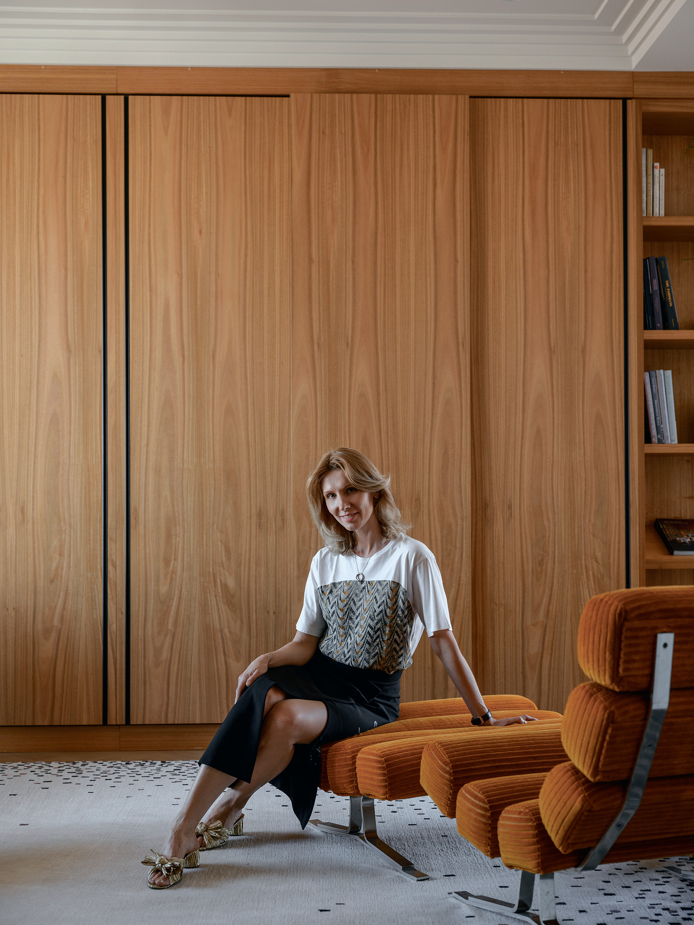 Окна гостиной обращены на три стороны света. «Когда я впервые сюда попала, было время заката, — вспоминает дизайнер. — Незабываемые впечатления! Тёплые солнечно-медовые лучи, которые лились из окон по стенам, захотелось максимально точно отразить в отделке». Так родилась идея стеновых панелей, выполненных из  тонированного шпона эвкалипта. Насыщенный цвет и благородство материала помогли собрать дробное пространство холла в единый парадный ансамбль. Перспективу замыкает картина «Георгий Победоносец» Евгения Голубцова, а лёгкую игривость