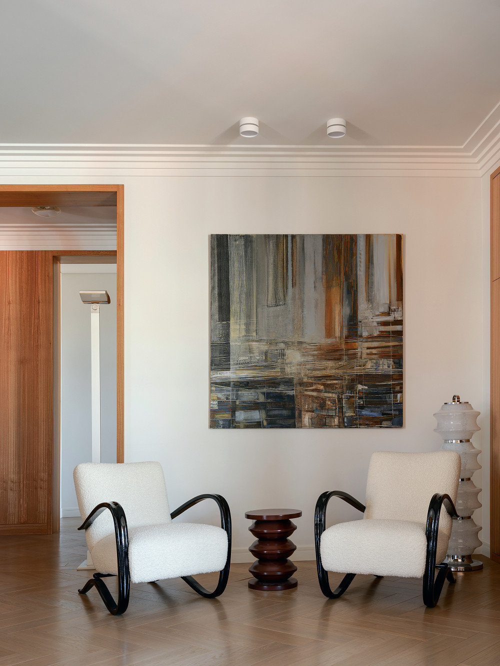 Окна гостиной обращены на три стороны света. «Когда я впервые сюда попала, было время заката, — вспоминает дизайнер. — Незабываемые впечатления! Тёплые солнечно-медовые лучи, которые лились из окон по стенам, захотелось максимально точно отразить в отделке». Так родилась идея стеновых панелей, выполненных из тонированного шпона эвкалипта. Насыщенный цвет и благородство материала помогли собрать дробное пространство холла в единый парадный ансамбль. Перспективу замыкает картина «Георгий Победоносец» Евгения Голубцова, а лёгкую игривость