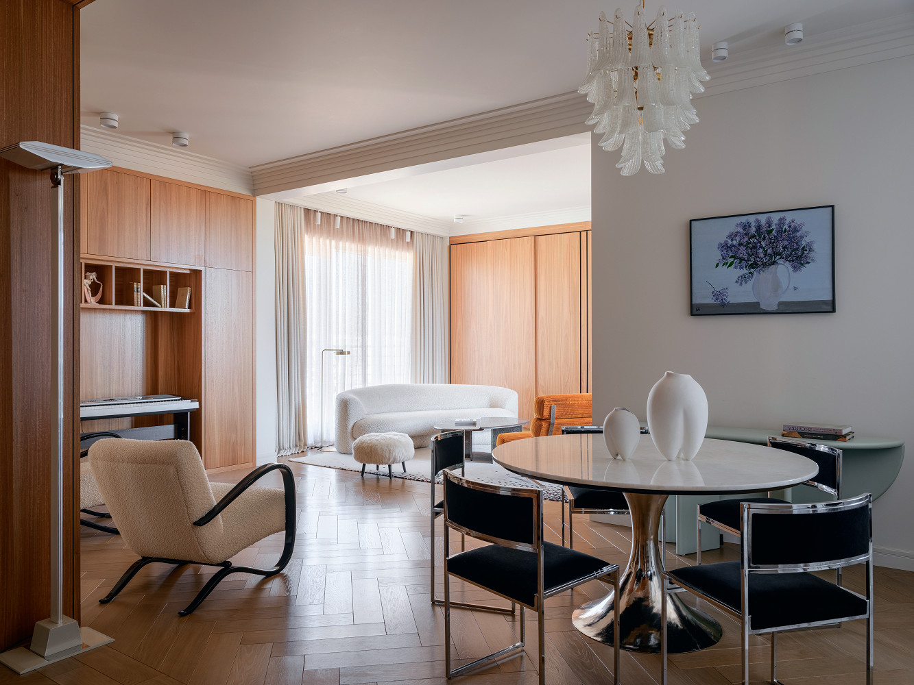 Из окон квартиры открывается вид на утопающие в зелени живописные крыши, слышно пение соловьёв, где-то отдалённо раздаётся гул города, но он совсем не тревожит. «Легко представить себе, что находишься в Петербурге или в Париже, но мы в самом центре Казани», — говорит дизайнер Екатерина Чернявская (cher.bureaux@gmail.com). Столь удачное расположение нового малоквартирного дома и послужило причиной тому, что заказчик принял решение о покупке недвижимости практически молниеносно. Причём приобрёл он не одну квартиру, а сразу две, которые затем объединили в пространство площадью 220 кв. м. «Я всегда иду от планировки, для меня это самый ответственный и увлекательный этап работы, который закладывает не только сценарий жизни владельцев, но и основу дизайна будущего интерьера, — продолжает Екатерина Чернявская. — Здесь самым сложным моментом было именно объединение двух квартир — в силу конструкции здания это получилось сделать только в одном достаточно узком месте. В результате образовался коридор длиной 12 метров и шириной полтора. Я долго ломала голову, как наполнить эту зону смыслом, добавив ей функций. Так по обеим сторонам от коридора образовались хозяйственные помещения, небольшой парадный холл перед мастер-спальней и ванная комната при ней с большим окном». Выступы несущих колонн и проёмов, которые визуально дробили и без того узкое пространство коридора, удалось смягчить при помощи отделки из натурального дерева. Материал был выбран не случайно.