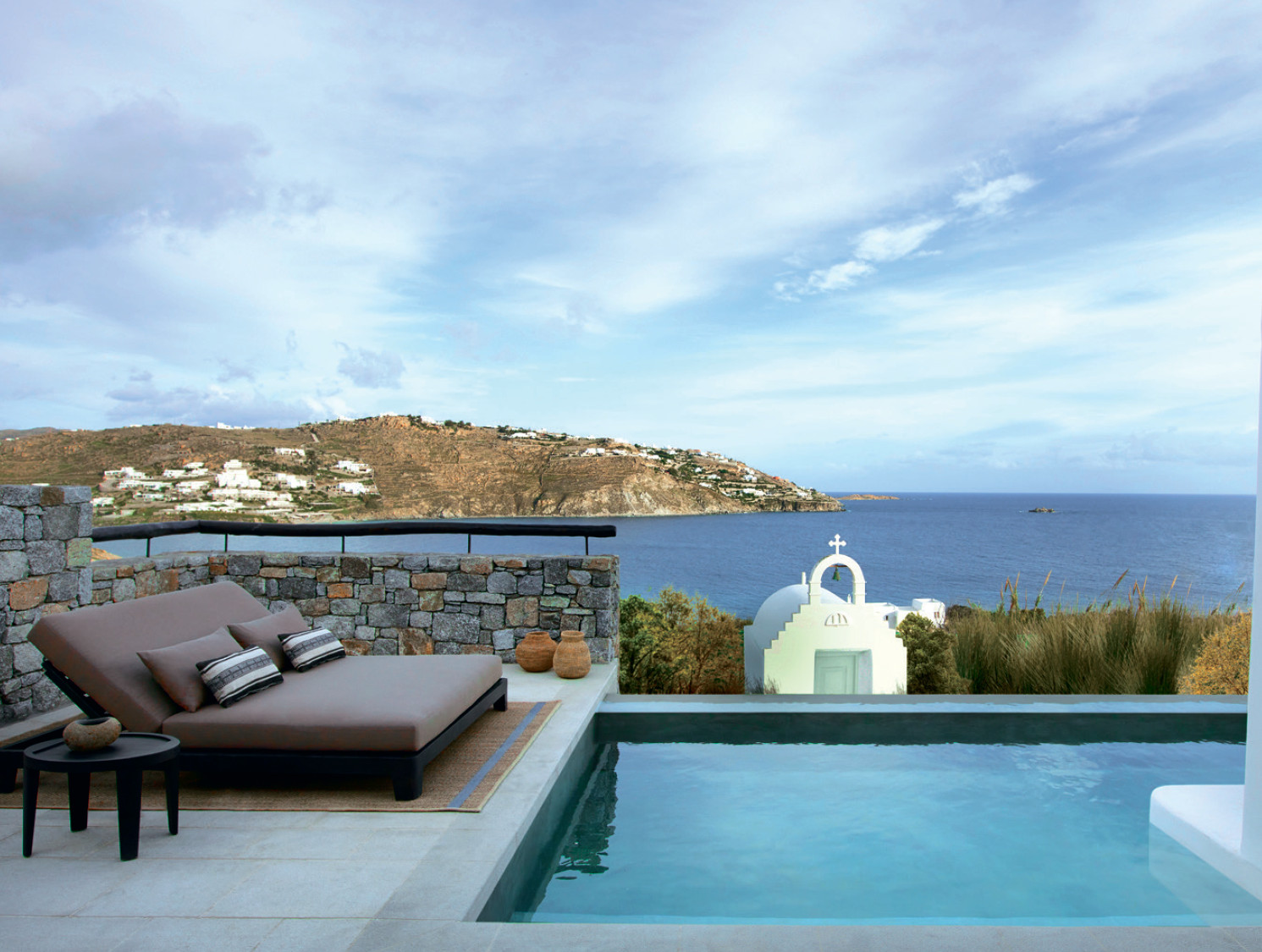 Дома с белыми каменными стенами на вершине холма над бухтой Орнос можно принять за старинную рыбацкую деревушку, но это курорт класса люкс, принадлежащий группе, которая управляет несколькими топовыми ресторанами в Афинах. Сложенные из кирпича печи — дань истории (по округе то и дело разносится аромат хориатико псиоми, или деревенского хлеба), есть здесь и канни — консьержи, которые подсказывают гостям, на какой пляж пойти в зависимости от направления ветра. От $1450
