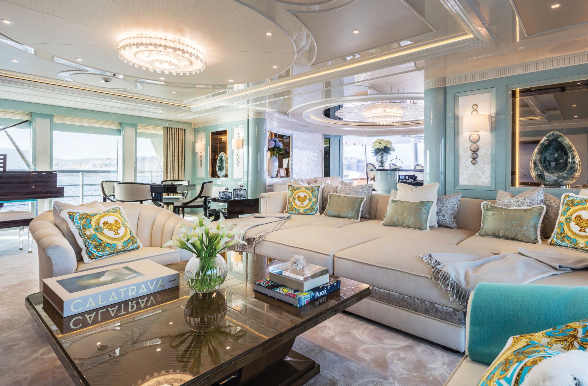 Чтобы обеспечить домашнюю атмосферу, команда дизайнеров во главе с Грейгом Джолли везде, где только возможно, постаралась уйти от мебели и декора, характерных для яхтенных интерьеров. «Мы стремились к эклектике, — говорит Джолли, — избегая однотипных объектов. Хотели создать ощущение, что предметы подбирались постепенно». Мебель покупали у итальянских и французских поставщиков или мастерили своими силами, используя ткани Rubelli, Pozzoli, Armani/Casa и Versace. Экспериментировали с выбеливанием и окраской.