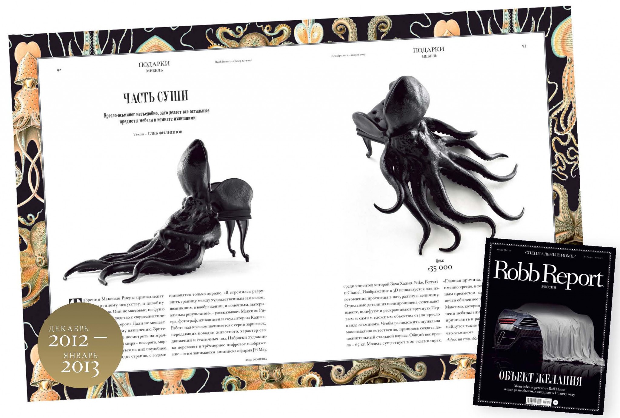 Персональный зверинец Максимо Риеры пополняется постоянно: теперь кроме роскошного кресла-осьминога в нём есть и носорог, и слон, и морж, и даже гигантская жаба. «Я не понимаю, почему кто-то должен решать за меня, что красиво, а что