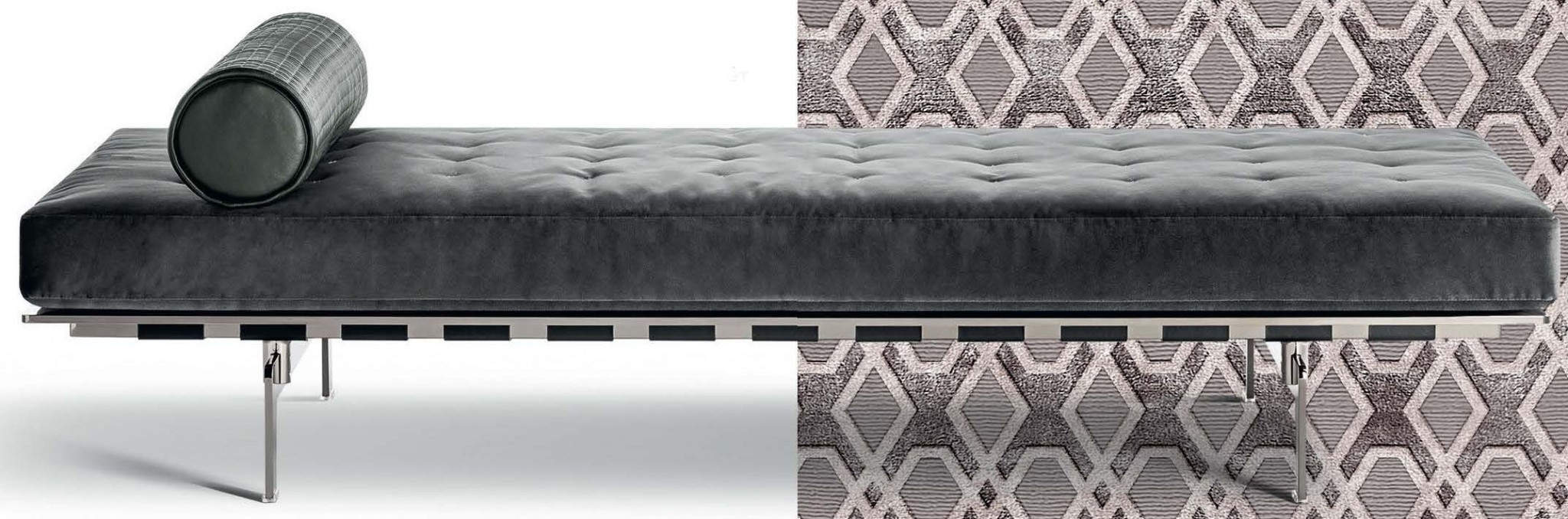 Раскладные зеркала по бокам комода Alivar Giano скрывают боко- вые секции с полками для парфюмерии и вешалками для ремней. Двухцветный ковёр Giorgetti Gradient Refl ex из бамбукового шёлка и льна изготовлен вруч- ную в технике тафтинга.