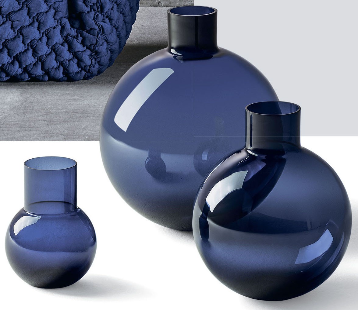 Если эксперименты с цветом для вас в новинку, начните с малого, например, с аксессуаров. Хороший старт дадут вазы из серии Blue Pallo по дизайну Карины Сет Андерссон. Первоначально они были придуманы для исторической шведской стеклянной мануфактуры Skruf, но на ней производили только минималистический вариант из белого стекла. А для Poltrona Frau было решено делать пепельно-синие вазы. Все модели, разумеется, выдуваются «вручную», а потом снабжаются личной подписью дизайнера.