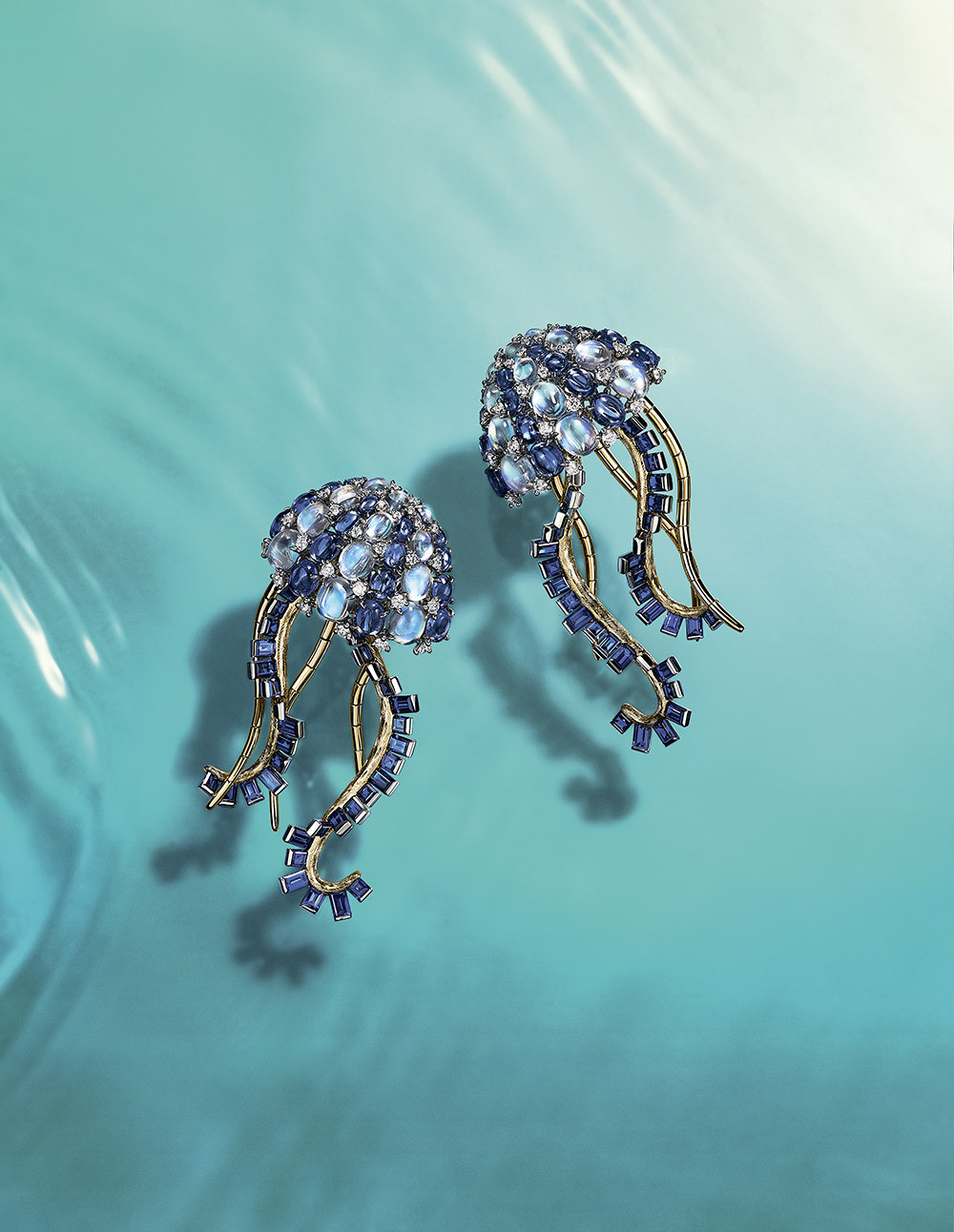 Фантастические морские твари и реальные обитатели подводных глубин стали героями новой саги Blue Book от Tiffany. Её сочинила новый креативный директор Дома Натали Вердей, вдохновившись творчеством Жан-Мишеля Шлюмберже. Невероятно плодовитый и талантливый французский ювелир более 30 лет проработал в нью-йоркском ателье марки. «Я хочу передать неоднородность вселенной», — говорил Шлюмберже. Отсюда выразительные органические формы и живые объёмы его скульптурных украшений, в которых природа гармонично сочеталась с геометрическими построениями. Коллекция Out of the Blue, выдержанная в палитре морской стихии, населена невиданными рыбами и морскими звёздами. Брошь Jellyfi sh — оммаж великому Шлюмберже: изогнутые щупальца из жёлтого золота с закреплёнными сапфировыми багетами создают ощущение танцующей под водой медузы.