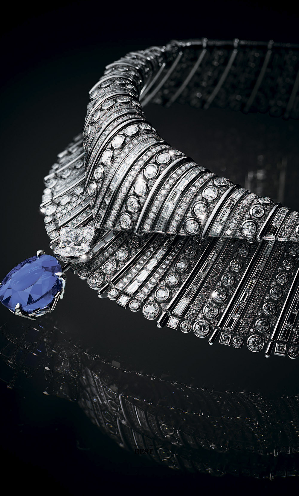 Ювелирные украшения для Дома Louis Vuitton уже пять лет создаёт Франческа Амфитеатроф. Её муза — современная женщина-воительница, сильная и независимая. Во имя неё дизайнер играет с модными кодами и ювелирными техниками, плетёт драгоценные колье-воротники, напоминающие кольчуги, и куёт золотые доспехи-браслеты. Новая коллекция Deep Time, рекордная по количеству украшений, повествует об истории формирования Земли и её геологическом наследии. В ней объединены темы цунами и извержения вулканов, а также сюжет о Гондване, древнем суперконтиненте в Южном полушарии. Несмотря на жёсткий силуэт, колье-воротник Wave невероятно динамично. Оно символизирует мощную вздымающуюся волну, которая вот-вот обрушится под натиском бриллиантов. К заострённой части в форме литеры V прикреплён бриллиант фирменной огранки LV Monogram, а бриллиантовая пена выносит на поверхность изумительный ярко-синий сапфир из Шри-Ланки весом 40,8 карата.