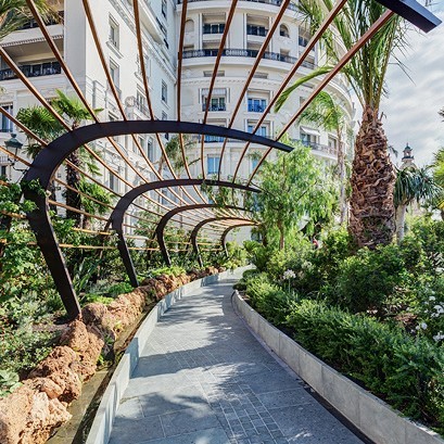 Пятилетняя реновация, закончившаяся в начале года, затронула не только интерьеры: в сердце отеля появилось уютное патио, а со стороны набережной — сад, спроектированный ландшафтным дизайнером Жаном Мюсом. Зелёный коридор с деревянными куполами-беседками напоминает об оливковых и цитрусовых рощах, которые цвели на плато Спелюг до закладки Casino de Monte-Carlo в 1858 году.