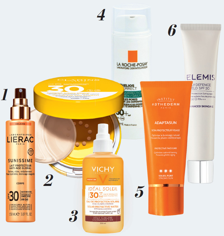 1. Солнцезащитное тонизирующее молочко для тела Sunissime, SPF 30+, Lierac (Foam). 2. Компактный солнцезащитный флюид для лица с лёгким тоном Compact Solaire Minéral Visage, SPF 30, Clarins. 3. Солнцезащитный двухфазный спрей-активатор загара Idéal Soleil, SPF 30, Vichy. 4. Солнцезащитное средство Anthelios Oil Correct для жирной, проблемной кожи, склонной к акне, SPF 50, La Roche-Posay. 5. Крем для лица в экстремальных солнечных условиях Adaptasun, Institut Esthederm (Foam). 6. Сверхлёгкий солнцезащитный крем с защитой от ультрафиолета и синего света гаджетов Daily Defence Shield, SPF 30, Elemis.