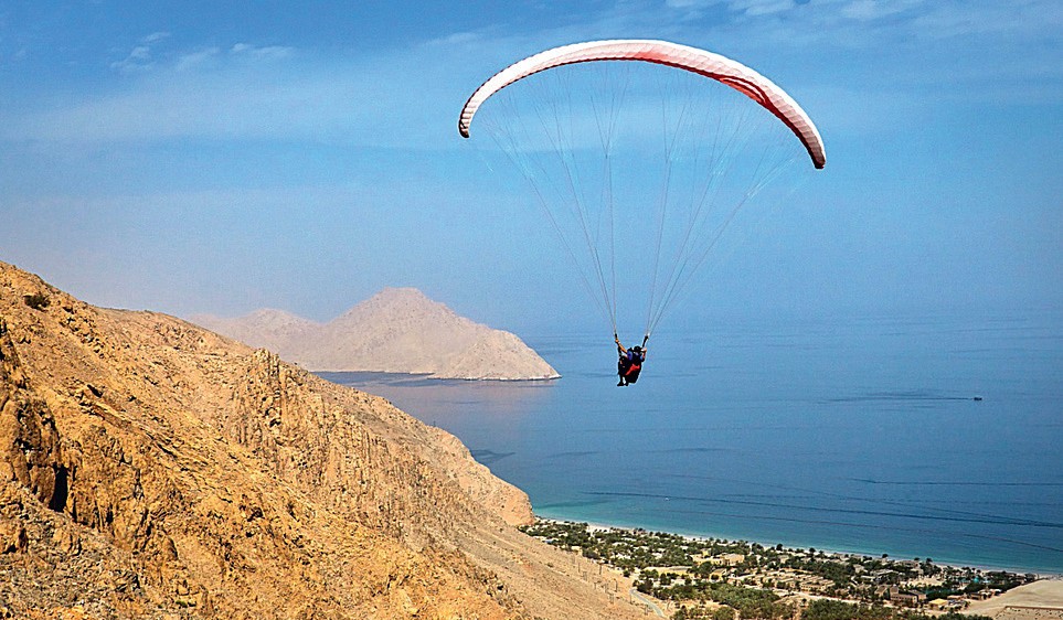 До полуострова Мусандам в Омане два часа пути от Дубая. В горах Зигхи автомобиль притормаживает на смотровой площадке, с которой видны курорт и песчаные пляжи Оманского залива. А дальше возможны два варианта: продолжать путь на колёсах или спланировать вниз с высоты 300 м в компании с профессиональным параглайдером, который поможет вам благополучно приземлиться у ресепшен.