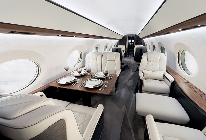 Первые поставки G700 намечены на 2022 год, пока же заинтересованные клиенты могут познакомиться с полноразмерным макетом его интерьера в Саванне, штат Джорджия, где находится штаб-квартира Gulfstream. Но это стоит того. G700 производит впечатление: он очень большой и очень красивый. В нём много пространства, заполненного естественным светом, а плавные S-образные изгибы по всему салону выглядят элегантно и чувственно. Большая часть интерьера декорирована ореховым шпоном с чёрными эбеновыми акцентами. Благодаря большим овальным иллюминаторам внутри много дневного света. Но и искусственный свет не раздражает — светодиодное освещение над головой имеет изогнутую архитектуру, так что лампочки остаются скрытыми от глаз.
