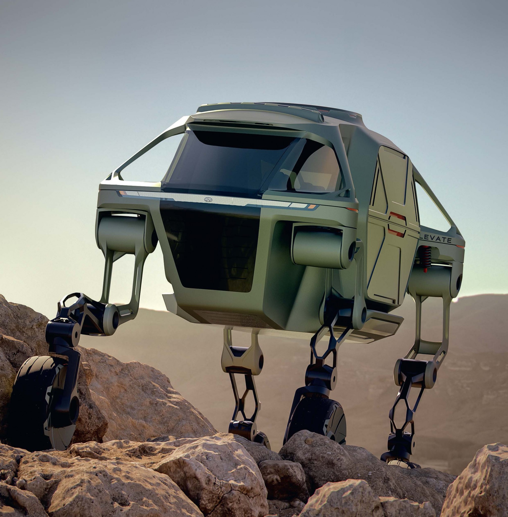 Создатели называют его «транспортным средством предельной проходимости» — Ultimate Mobility Vehicle. Это не очередной маркетинговый ход: каждая нога Elevate обладает пятью степенями свободы, что позволяет концепту преодолевать преграды высотой более полутора метров. В сложенном состоянии конечности работают как обычная подвеска с пружинными элементами и амортизаторами, а при необходимости