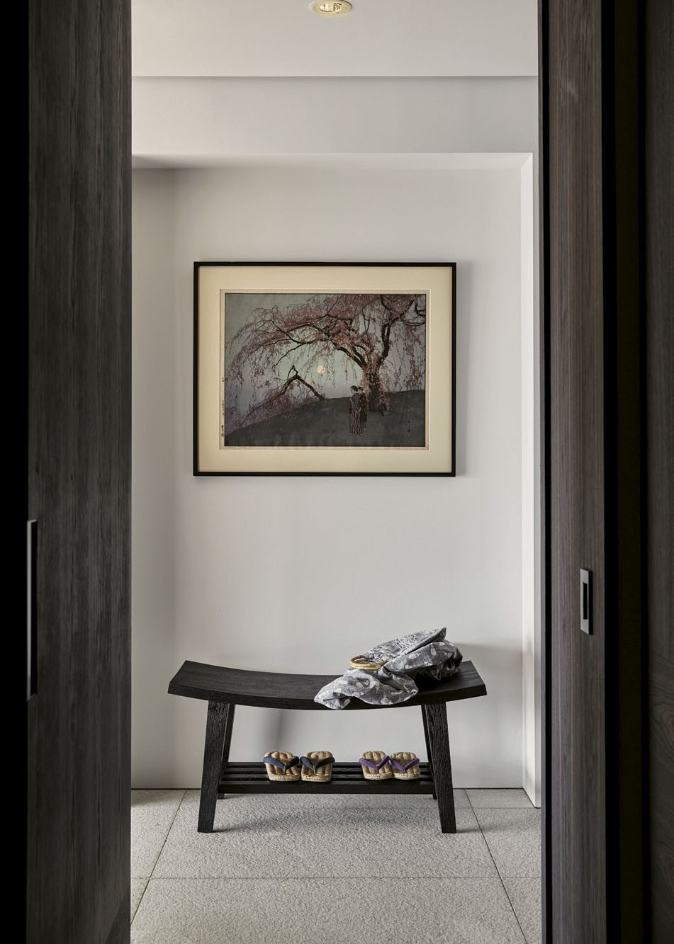 Выбор цвета навеяла японская каллиграфия сёдо, что очевидно, когда видишь контраст белых стен с тёмным морёным деревом — примерно так же выглядят внешние поверхности японских домов, обработанные огнём в технике якисуги. О сделанной на заказ мебели Мейер говорит так: «Масштаб здесь особенный — отличается широтой и размахом. Мы применили европейские пропорции и понятие о комфорте, но не утратили сдержанности и тонкости, свойственных японской культуре». Вход оформляет большое живописное полотно — идеальный объект для созерцания.