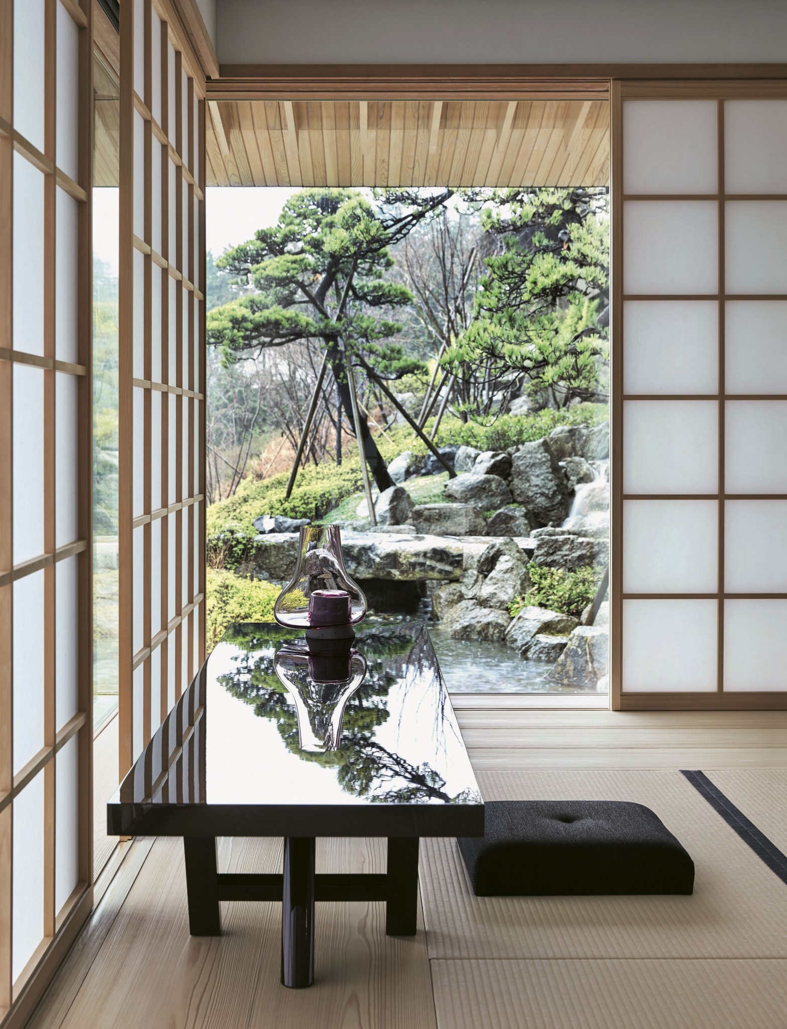 Формально на частной территории расположены главный корпус, спа, два дома для гостей и чайный домик. Но на более глубоком уровне, как объясняет креативный директор Liaigre Фрауке Мейер, «это место даёт пищу для всех органов чувств. Здесь несколько слоёв — тропинки, вода, камни, сады, — которые проступают один за другим». Вход в спальню дарит паузу в путешествии по дому. В приватных апартаментах расположились низкие столики, татами и бумажные перегородки сёдзи.