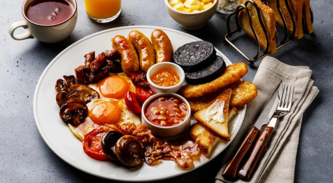 Начнем, как положено, с завтрака . Классику английской драматургии Сомерсету Моэму приписывают цитату: «Если вы хотите хорошо питаться в Англии, то ешьте завтрак три раза в день». И правда, по калорийности утренний прием пищи превосходит любые мировые аналоги. Full english breakfast включает в себя хлеб, яйца, жареные полоски бекон (bacon bits), колбаски, помидоры. А также фасоль в томатном соусе, грибы, поджарку из картофеля с капустой или некое подобие картофельного драника (hush browns). Все это принято запивать большим количеством крепкого, сладкого чая, разбавленного молоком. Пара тысяч калорий — и промозглые лондонские туманы не страшны!