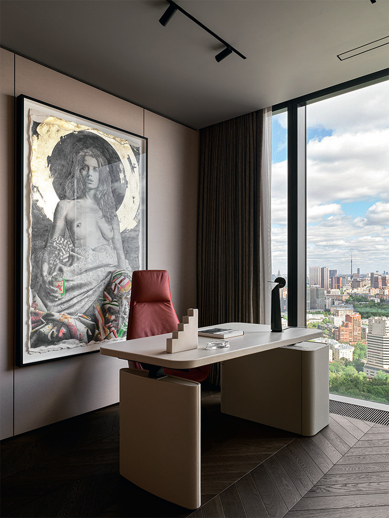 Полотно пара купила давно, для него заранее выбрали место и цвет стены: тёмно-графитовая живопись чётко выделяется на серовато-синем фоне. Другие работы Зорикто из коллекции хозяев украшают галерею, ведущую в мастерблок. В кабинете владелицы квартиры — ещё одно впечатляющее полотно: экспрессивное ню испанского художника Габриэля Морено. Обшитый натуральной кожей рабочий стол сделан на заказ российской компанией: клиентке была нужна модель со скрытым подъёмным механизмом столешницы, позволяющая работать и сидя, и стоя.