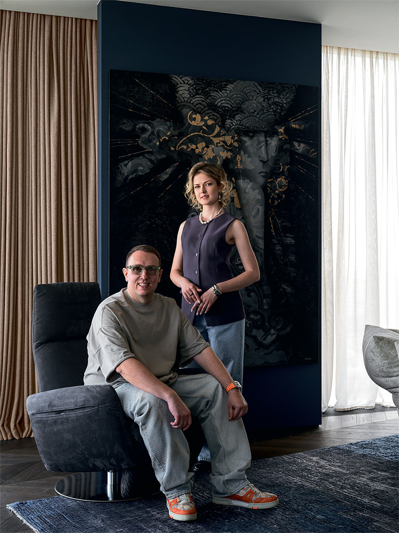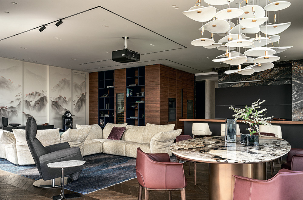 «Работать с заказчиками — супружеской парой с маленькой дочкой — было не всегда легко, но всегда интересно, — рассказывает о проекте Алёна Аксёнова. — Это люди насмотренные: много путешествуют, любят и коллекционируют искусство. Они сами предлагали нам интересные идеи, поскольку хотели создать своё особенное, неповторимое жилище». Основной идеей интерьера стали восточные мотивы: заказчики любят Юго-Восточную Азию. Чтобы передать «дух Востока», был найден беспроигрышный ход: имитация традиционной китайской живописи. «Мы решили сделать “псевдоширмы” с перепадами панелей, объединённых единым рисунком, — объясняет Алёна. — Рисунки выбирали из каталога московского производителя обоев ручной работы Fresq. Но не хватало цветных и золотистых акцентов для поддержки гранита в зоне кухни, так что их эскизы пришлось доработать. Мы выбирали эскизы, и художники рисовали “ширмы” вручную». Одна из «створок ширмы» — скрытая дверь в приватный мастер-блок. Самое просторное помещение квартиры — гостиная-кухня неправильной формы. Чтобы обыграть эту форму, для пола выбрали дубовую доску с раскладкой «ёлочкой». Пространство условно разделено на три части: отделённую барной стойкой кухню, зону гостиной с диваном Edra и обеденную зону, где над столом размещён светильник, акцентный арт-объект. Он сделан на заказ в Италии. Одни плафоны люстры светят вниз, другие — вверх, и отражённый от потолка свет создаёт мягкое мерцание. Центр внимания в зоне гостиной — полотно Зорикто Доржиева, одного из любимых заказчиками художников.