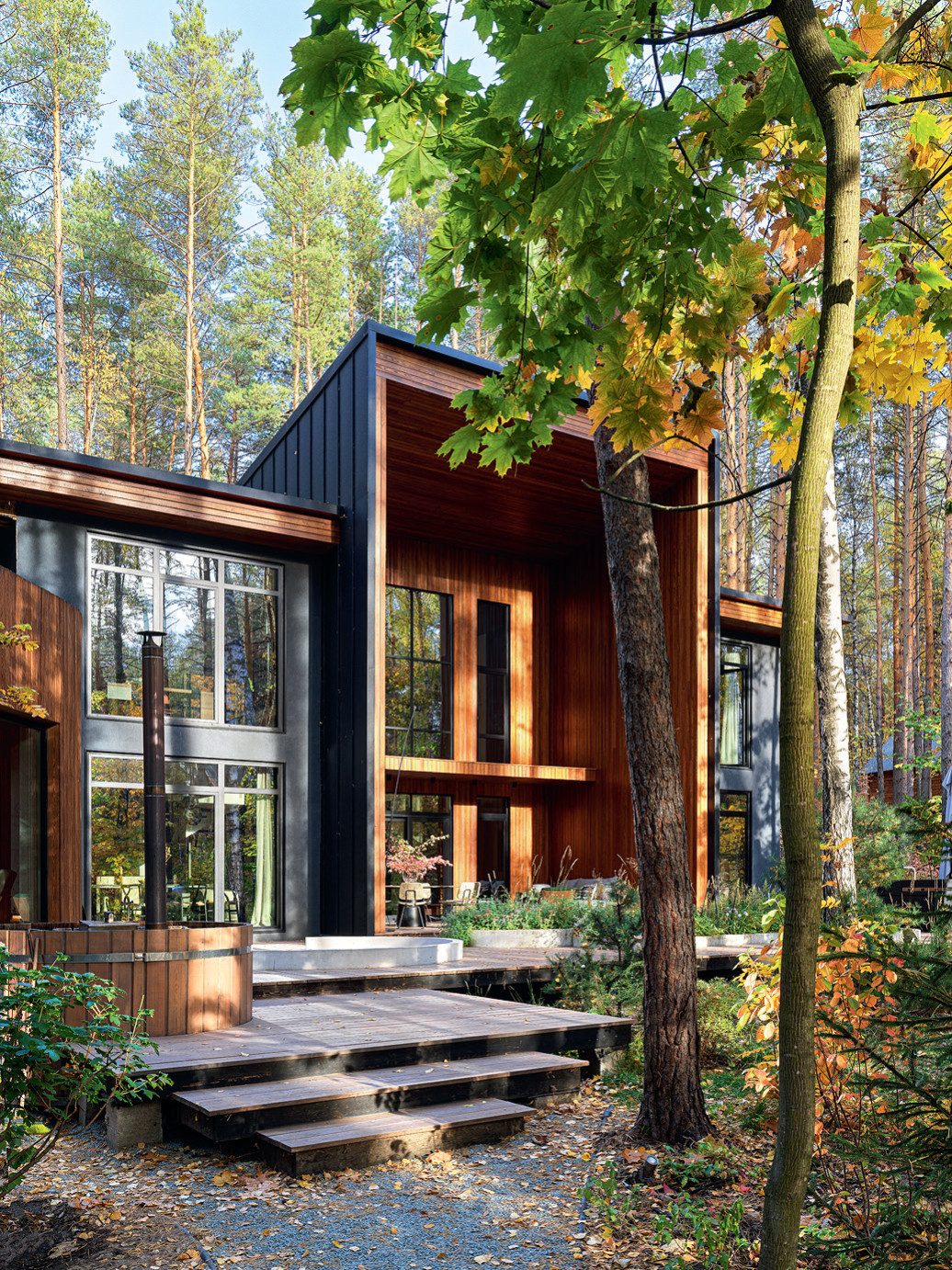 Дом общей площадью 360 кв. м построен по каркасной технологии. Он расположился в пригороде Казани в тишине соснового леса. «Работа над проектом началась в 2018 году, — рассказывает дизайнер. — По эскизам Петра Сафиуллина мы возвели здание, а уже позже я занималась оформлением внутренних пространств. Основной целью, которую мы поставили перед собой изначально, было максимально органично вписать дом в окружающий пейзаж». Цветовая гамма, материалы отделки и панорамные окна с видом на лес позволили практически стереть границу между интерьером и экстерьером. В ходе работы над проектом на более поздних этапах Оксана внесла некоторые изменения в функциональную схему и отчасти в архитектуру. Перенос кухни позволил увеличить окна первого этажа с выходом на террасу, а под антресолью второго этажа расположить рабочие поверхности с большим отдельно стоящим островом, который стал неотъемлемой частью семейных кулинарных вечеров.