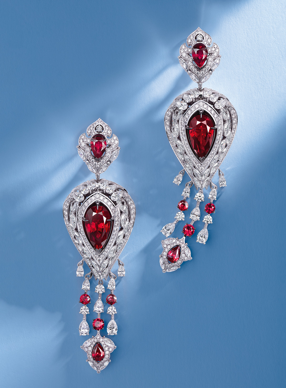 RR не раз писал, что цветные драгоценные камни становятся не только эмоциональной, но и весомой материальной инвестицией, а также предметом коллекционирования. Пример — удлинённые серьги ювелирного дома Chamovskikh «Великая Держава». Взгляд привлекают два уникальных рубина Pigeon’s Blood огранки «груша» суммарным весом более 10,5 карата. Найти такой дуэт — редкая удача для коллекционера. Центральные камни окружены 732 бриллиантами общим весом более 16 каратов и дополнены 12 рубинами разной огранки, но равно безупречных характеристик. Классическая оправа в полной мере отвечает великолепию камней и концептуальному замыслу вечерней парюры. Мастера дома сделали серьги трансформерами: остроумное техническое решение оправы позволяет носить украшение в четырёх вариантах. В композиции сложного дизайна можно рассмотреть бриллиантовые ленты, отсылающие к муаровым орденским лентам как атрибуту придворного платья. Ленты соединяются под знаком Большой императорской короны, образуя символическую букву V — Victory, Победа.