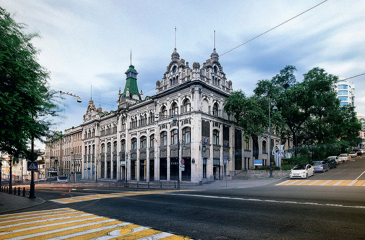 Построенный в 1906—1907 годах Универсальный магазин торгового дома «Кунст и Альберс» — одно из самых интересных зданий Владивостока. Архитектор Георгий Юнгхендель и инженер Иогансон спроектировали магазин в стиле романтического модерна с элементами средневековой архитектуры Западной Европы и ориентальными китайскими инспирациями. Трёхчастная симметричная композиция главного фасада с центральной осью, выделенной массивными пилонами и козырьком, увенчана башенной надстройкой с шатрово-купольным завершением. На фасаде красуются символы бога торговли Меркурия и маскароны с мордами китайских драконов.