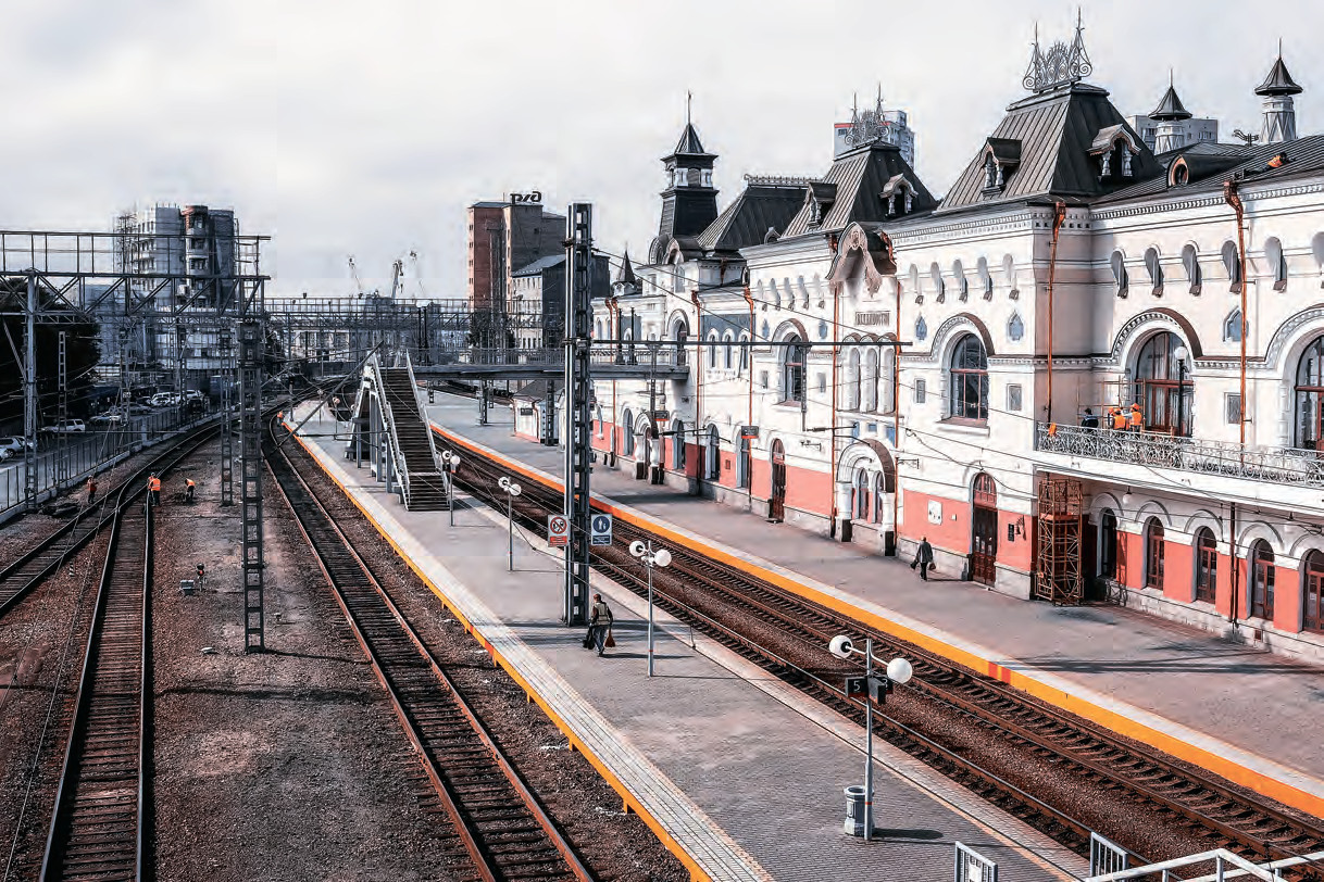 От Москвы до Владивостока по Транссибирской магистрали — 9288 км, это шесть с лишним дней в пути. Железнодорожный вокзал Владивостока, построенный ещё в 1890-е, к 1912-му превратился в стилистическое подобие столичного Ярославского: Транссиб начинается и заканчивается на вокзалах в едином стиле. Владивостокское здание строил архитектор Владимир Плансон, ориентировавшийся на «неорусскую» работу Фёдора Шехтеля в Москве: та же гипертрофированно высокая кровля, увенчанная ажурным гребешком, та же «узорочная» отделка фасадов. Но есть и отличия: пол во Владивостоке выложен японскими плитами, а вместо панно и фризов по эскизам Коровина — работа советского художника Герасименко «Наша великая Родина».