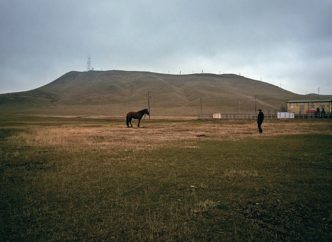 Али спускается вниз. Рыжий конь щиплет траву. Земля за ним убегает к электрическим вышкам. Конь шарахается от Али.