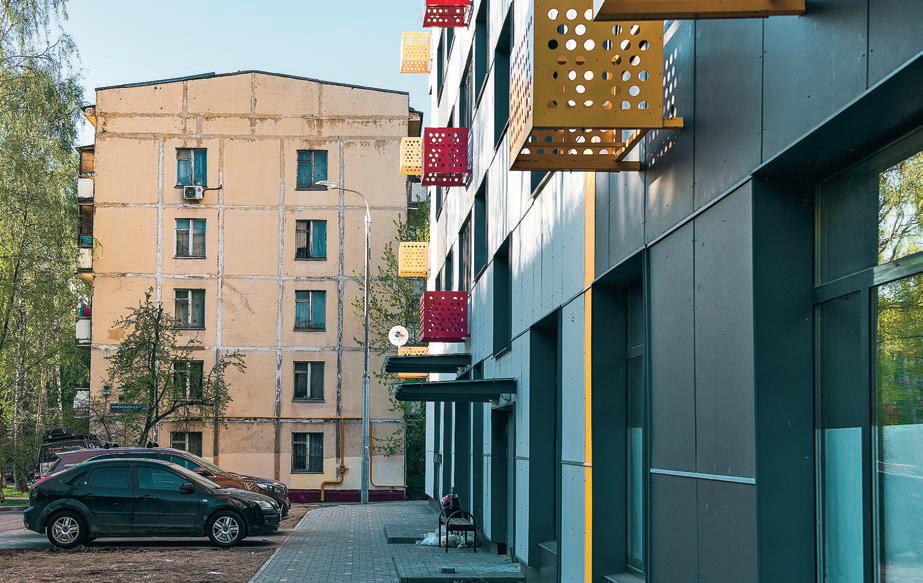 Из-за дома выглядывает малоэтажный комплекс бизнес-класса, в стиле 90-х, который когда-то был укрыт за линией пятиэтажек и считался «шикарным». Справа от него — убогий двухэтажный торговый центр советских времен. Среди пятиэтажек он не бросался в глаза, но их больше нет. Напротив, через дорогу, — сияющий новый торговый центр «Кунцевоплаза».