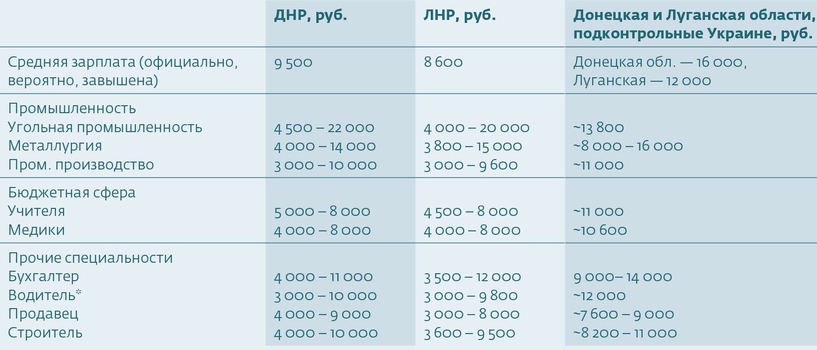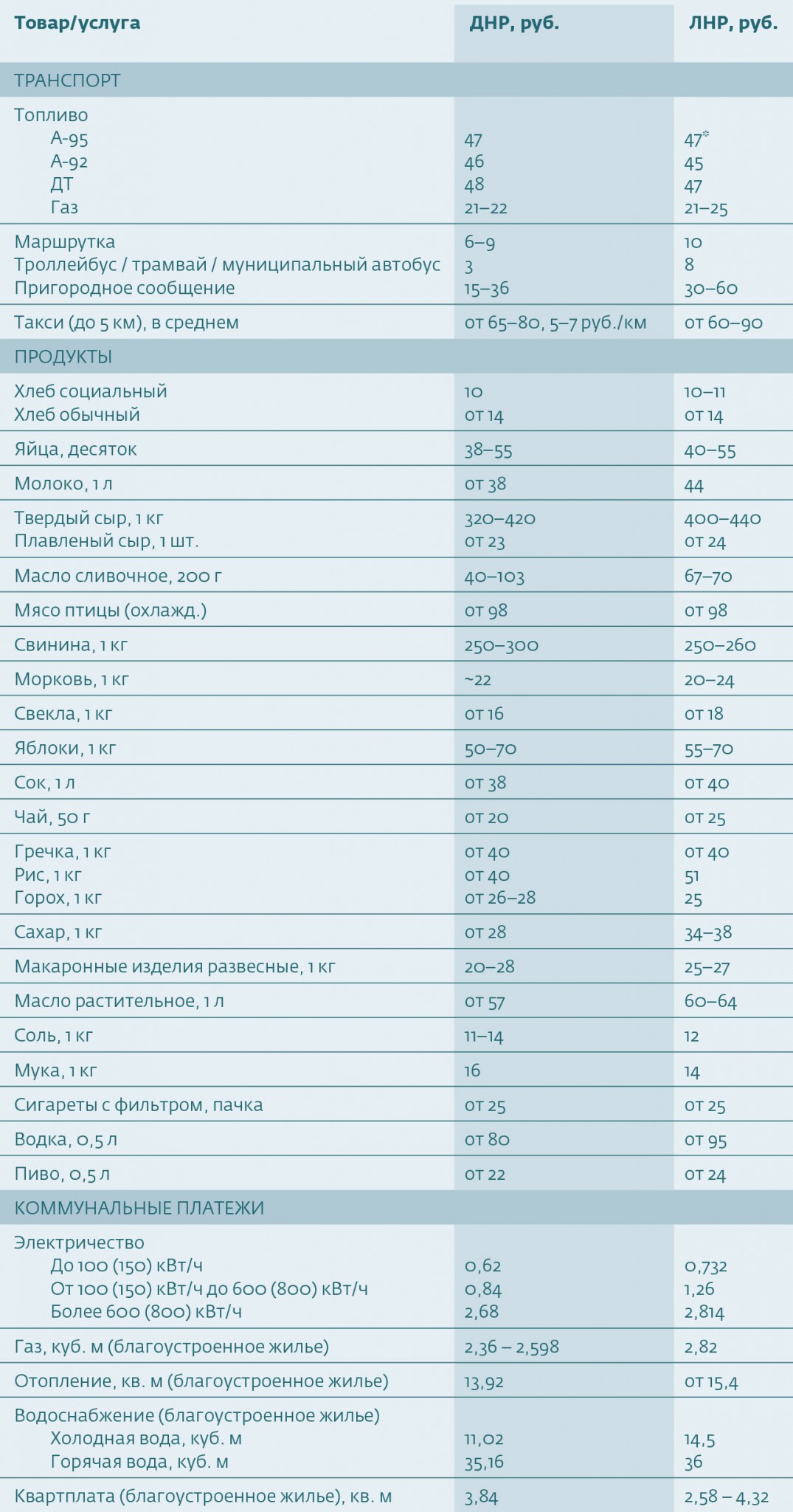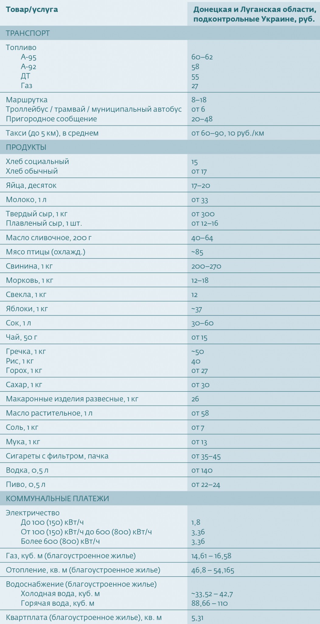 Для того чтобы ознакомиться с зарплатами жителей ДНР, можно зайти на сайт Республиканского центра занятости. Например, электромонтеру по ремонту и обслуживанию оборудования предлагают 5401 рубль в месяц, слесарю-ремонтнику — столько же, каменщику — 5000. Крупные производства Республики лишились украинских рынков сбыта, но не закрыты. Возобновил работу Юзовский метзавод, закрытый после начала блокады. Но путь к восстановлению лежит через открытые рынки сбыта и через спрос не только на металл, но и на уголь, на химию. Таких рынков нет, и спроса такого тоже нет. Донецкий металл продается по демпинговым ценам, и его берут те, кому дела нет до его происхождения и до того, сколько денег получил рабочий на предприятии. Покупатели и продавцы вовсе не озабочены нравственными принципами. Но, с другой стороны, у них ведь нет и цели победить в гражданской войне. Между тем цены в республиканских магазинах не сильно отличаются от московских. Бананы стоят 70–75 рублей, огурцы — 90–120, яйца — 35–40, куриные крылья — 90, сыр — от 370, свинина — от 240. И на мой вопрос, почему такие дорогие груши, продавец республиканского магазина с горечью ответил: «Приличные жители ДНР груш не едят!».