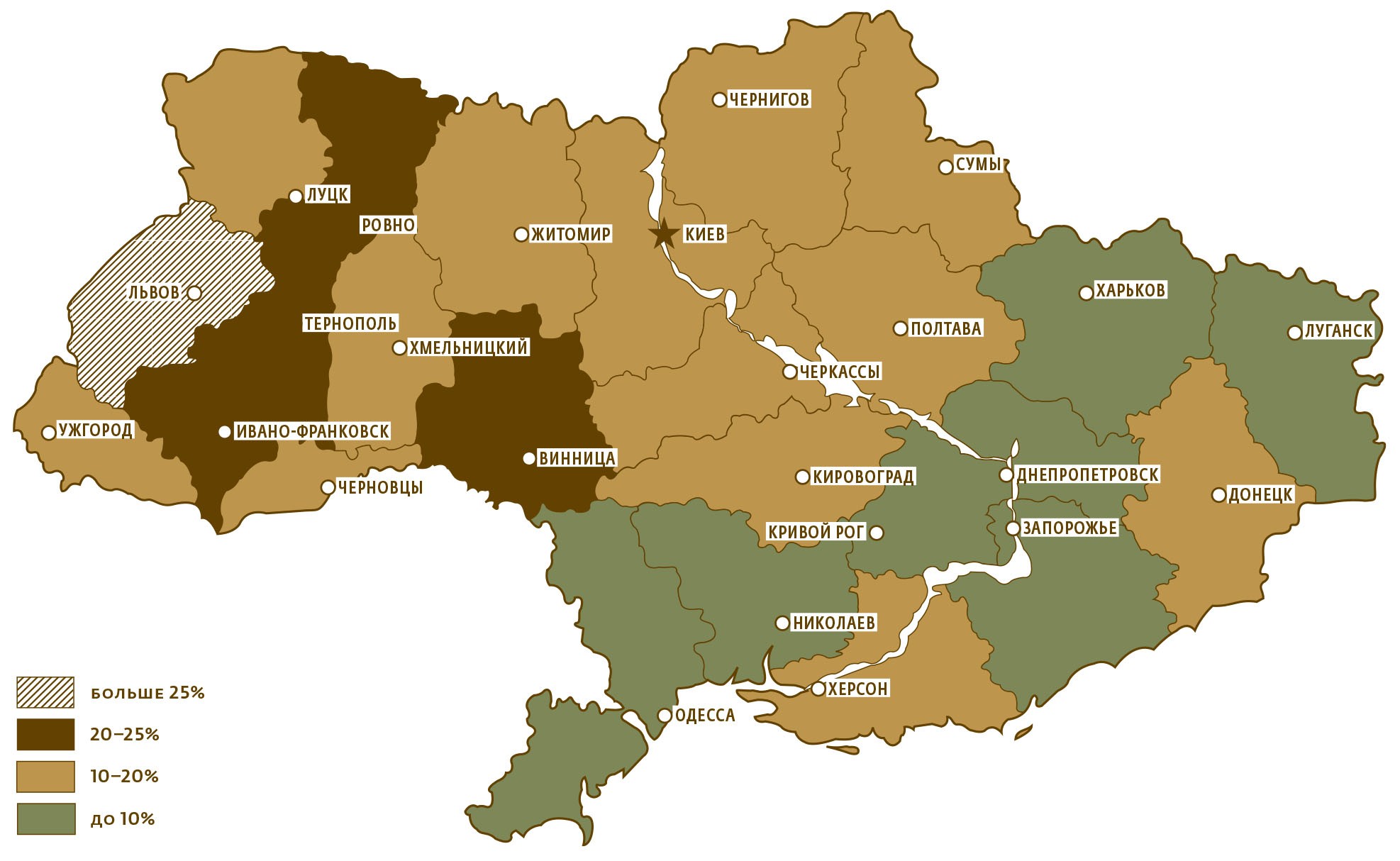 Порошенко выиграл только в двух регионах, причем только во Львовской области набрал 35% (в другой победной области, Тернопольской, гораздо меньше — 24%). Львов по-прежнему является оплотом украинского национализма и плохо понимает днепропетровские шутки; именно львовских парней непропорционально часто призывают воевать и умирать на Донбассе. Зеленский победил почти везде, больше всего взял в родном Днепре, но и в Юго-Восточных Одессе, Николаеве и Запорожье, как и во вполне западном (но многонациональном и, в общем, интернациональном) Закарпатье — почти по 40%.