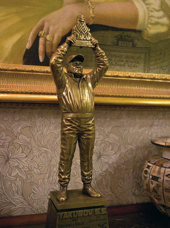 Со своей супругой Ольгой Ивановной он встречает нас у себя дома, в Набережных Челнах. Одна из комнат освещена ярче остальных. Оказывается, это солнечный свет отражается от бронзовых статуэток, изображающих бедуина. Такие получают победители и призеры Дакара — самого престижного авторалли. Статуэток так много, что не сразу удается сосчитать.