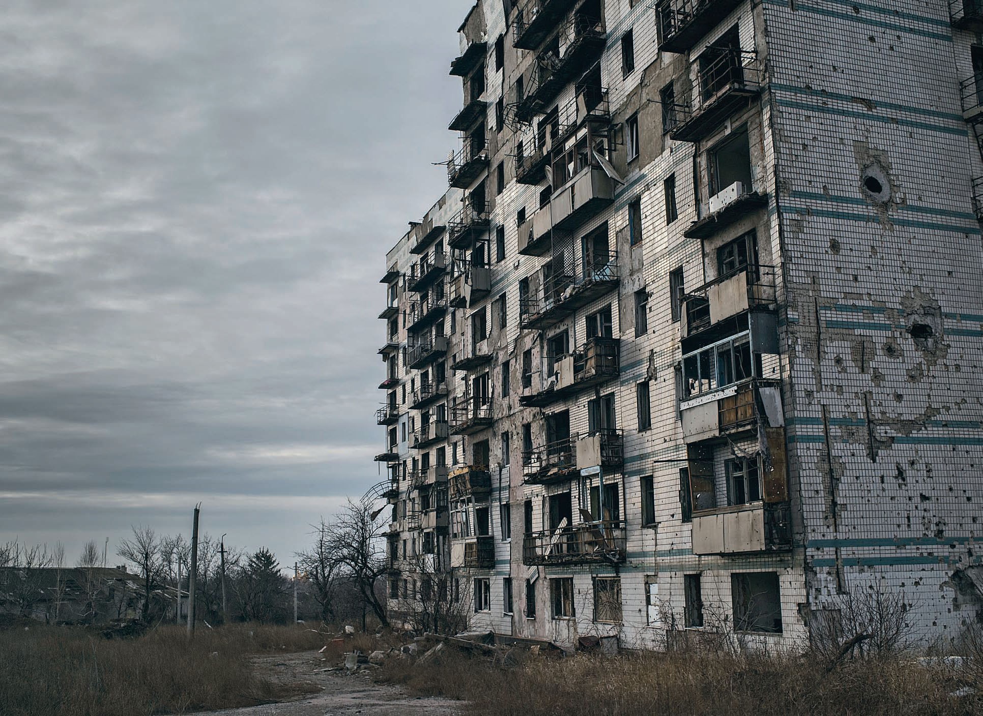Злата кружит по двору, заваленному отсыревшими шкафами и розовыми подушками, оставляя на мокром снегу множество следов. Подруга, с которой она пришла на Путиловку проведать разбитую квартиру, стоит на месте, засунув руки в карманы куртки, и наблюдает за ее перемещениями. Желтое лицо дома побито осколками, отсыревшие балконы забиты фанерой, но окна забраны в новый пластик, белый цвет которого смотрится инородно, даже в сравнении со снегом, который только что все укрыл, но прямо сейчас будет таять. На голубой двери, ведущей в подвал, нарисован крест — в острую фазу войны тут располагался медпункт ополчения. — Я просто не понимаю, зачем они прилепили эти гуманитарные окна, — говорит Злата, — на эту развалину. Здесь все равно никогда уже никто не будет жить. Только деньги взяли.