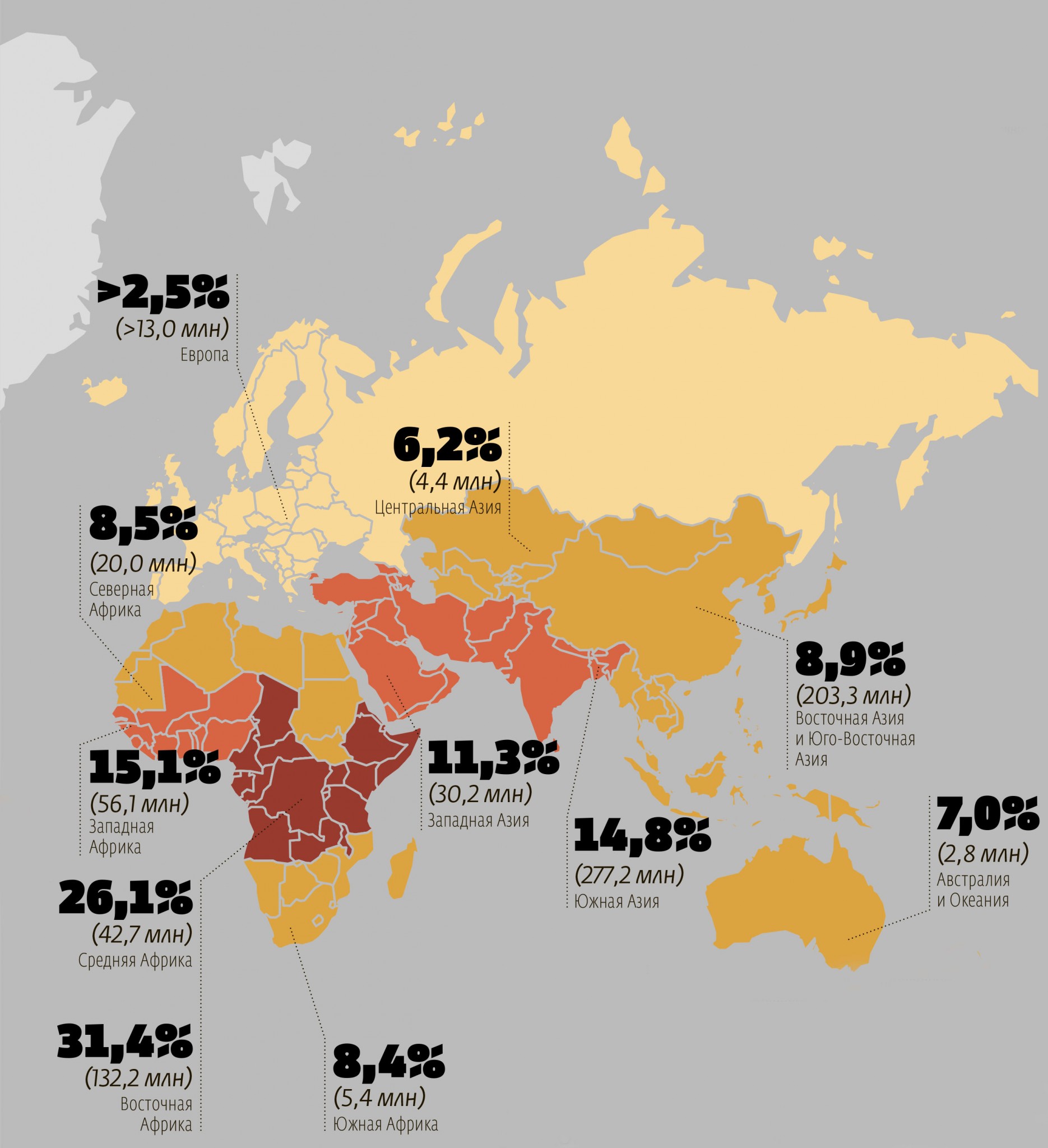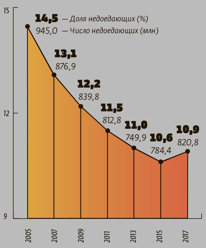 Мы привыкли к тому, что технический прогресс делает голод все более редким явлением, но уже около пяти лет число голодающих в мире растет — впервые за послевоенные годы. По данным доклада ООН «Положение дел в области продовольственной безопасности и питания в мире — 2018», только за один год — с 2016-го по 2017-й — количество страдающих от голода жителей планеты увеличилось на 17 миллионов. Недоедает каждый девятый житель планеты. Почему прогресс затормозился? Авторы исследования выделяют две главные причины перемен к худшему: засухи — из-за глобального потепления и расширение зон военных конфликтов. Ситуация ухудшилась в большинстве регионов Африки и в Южной Америке, и даже характерная в последние десятилетия для Азии тенденция снижения уровня недоедания значительно замедлилась.