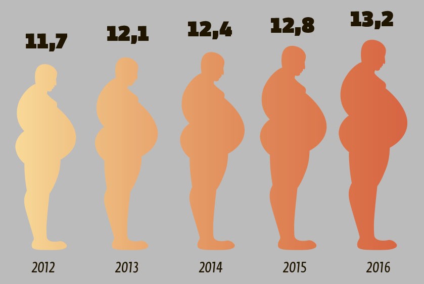 672 млн взрослых страдают от ожирения (13%, или каждый восьмой)