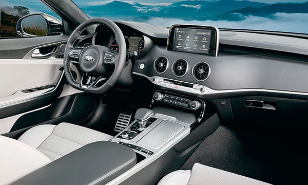 Stinger обещает путешествие со вкусом и продолжает эту линию в салоне, который совсем не похож на семейные модели марки. Хронометры приборов, усеченный руль и хромированные педали — закон жанра, но главной характеристикой интерьера будет элегантность. Панель с турбинами дефлекторов не кажется перегруженной, функционал бортовых систем аккуратно переложен на два ряда кнопок, а экран медиа-системы предельно аккуратно вписан в консоль, которая чуть развернута к водителю.