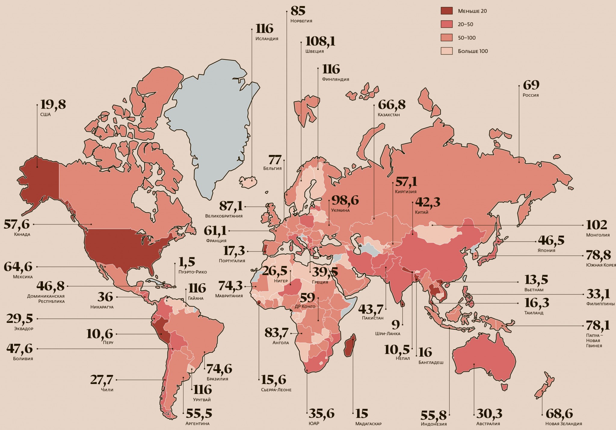 Россия сейчас находится примерно в середине списка, однако, по совокупным данным, за последние 20 лет она вошла в десятку стран, где шансы погибнуть от опасного климатического явления довольно высоки: на каждые 100 000 смертей у нас приходится примерно два подобных случая.