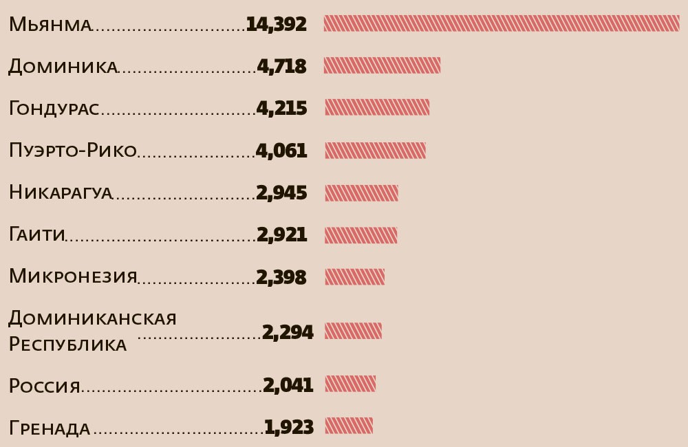 Где в мире шансы умереть от опасного климатического явления выше всего (количество смертей на 100 000 населения по данным за 1998–2017 годы)