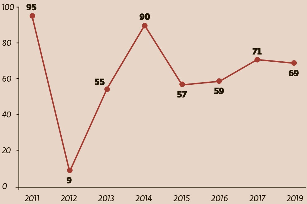 Как менялось место России в рейтинге самых климатически небезопасных стран (чем выше место — тем безопасней).