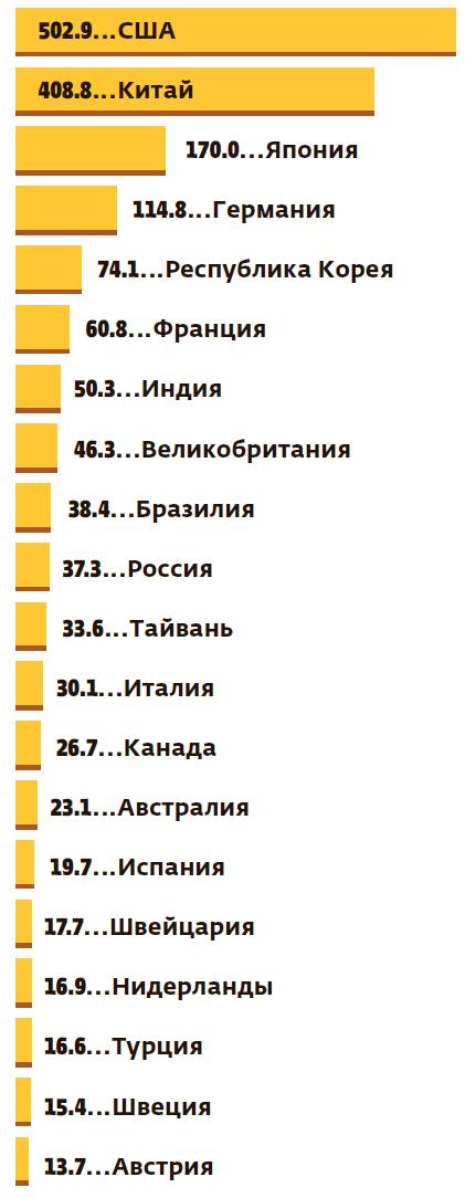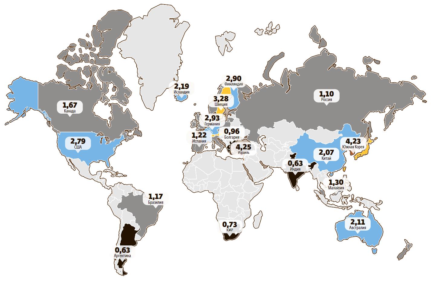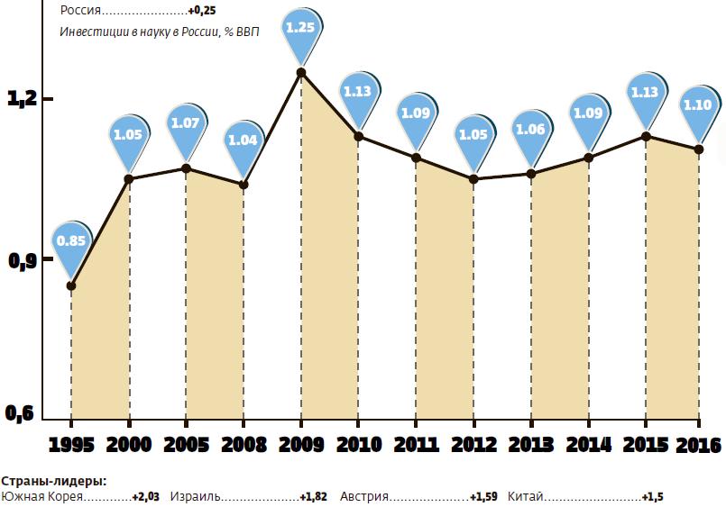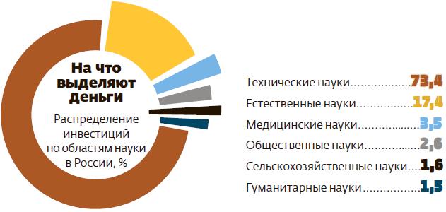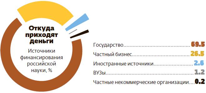 По данным, собранным Высшей школой экономики, Россия занимает десятое место по объему инвестиций в исследования и разработки; вроде бы неплохо, но все зависит от того, чего мы хотим. Мы вкладываем в науку в два раза меньше денег, чем маленькая Южная Корея, отстаем по этому параметру и от пока не самых развитых в мире Бразилии или Индии. Причем если мир наращивает инвестиции, то в России за последние 20 лет в этом плане мало что изменилось — мы по-прежнему готовы вложить в науку лишь около 1% ВВП. По этому показателю мы занимаем лишь 35-е место в мире.