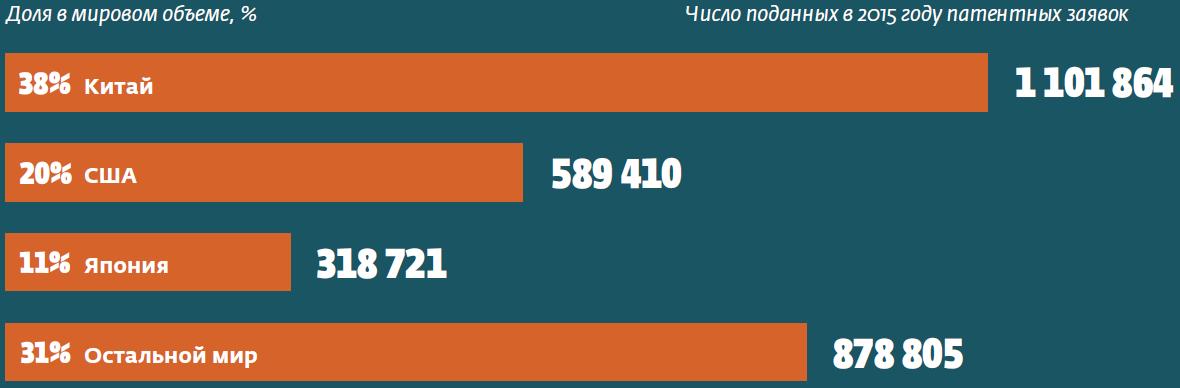 Темпы прогресса растут: в 2015 году было подано на 7,8% патентных заявок больше, чем в 2014-м, а за 10 лет их число увеличилось более чем в два раза. Безусловным мировым лидером в области инноваций является Китай; он же показывает самый быстрый рост числа изобретений (почти на 20% в год) — то есть все дальше отрывается от конкурентов. У России с общим количеством патентов дела обстоят на порядок скромнее, зато по скорости роста мы в тройке мировых лидеров: за 2015 год наши изобретатели подали на 13% больше заявок, чем за 2014-й.