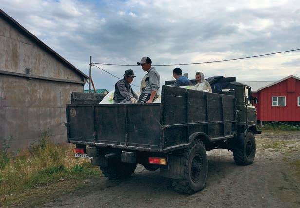 По обеим сторонам дороги стоят вездеходы на гусеницах, похожие на бронированные боевые машины. Говорят, в этот поселок привозят московских депутатов и чиновников, демонстрируя им маленькие коттеджи, построенные при Абрамовиче на месте бараков, и вселяя мысль о том, что все чукотские поселки благополучны и похожи на Канчалан. Из-за поворота наконец выходит человек.