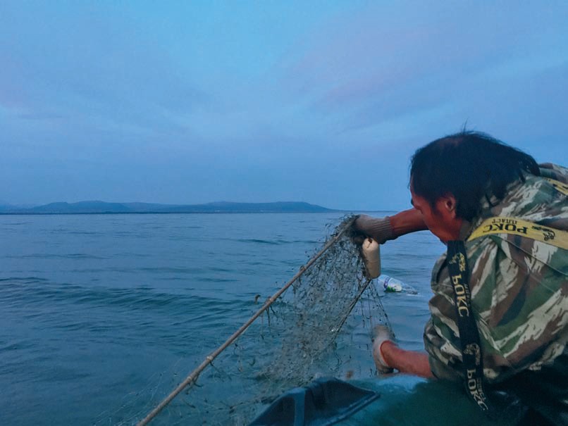 Поднявшись, он тащит черную резиновую лодку к воде, которая у кромки грязновато серая, а ближе к горизонту, за которым встают туманные сопки, серебрится, как чешуя вынутой женскими руками рыбы.