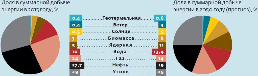Переход на возобновляемые источники энергии откладывается. Согласно докладу энергетической консалтинговой компании DNV GL, в 2050 году потребление первичной энергии будет меньше, чем в 2015-м, а доля ископаемого сырья в суммарном потреблении энергии сократится с нынешних 81% до 52%. Природный газ примерно в 2034 году станет крупнейшим источником энергии, а уголь постепенно практически уйдет из мирового энергоснабжения.