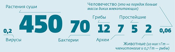 Биологи из Израиля и США провели «перепись» всех известных видов живых существ, чтобы оценить их биомассу. По их подсчетам, общая масса биосферы Земли составляет примерно 550 миллиардов тонн. Оказалось, что более 80 процентов от этого числа приходится на растения, а суммарная биомасса наземных организмов примерно в сто больше, чем морских.