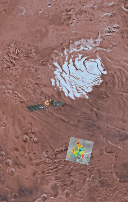 Станция Mars Express и южная полярная шапка Марса, под которой расположено озеро