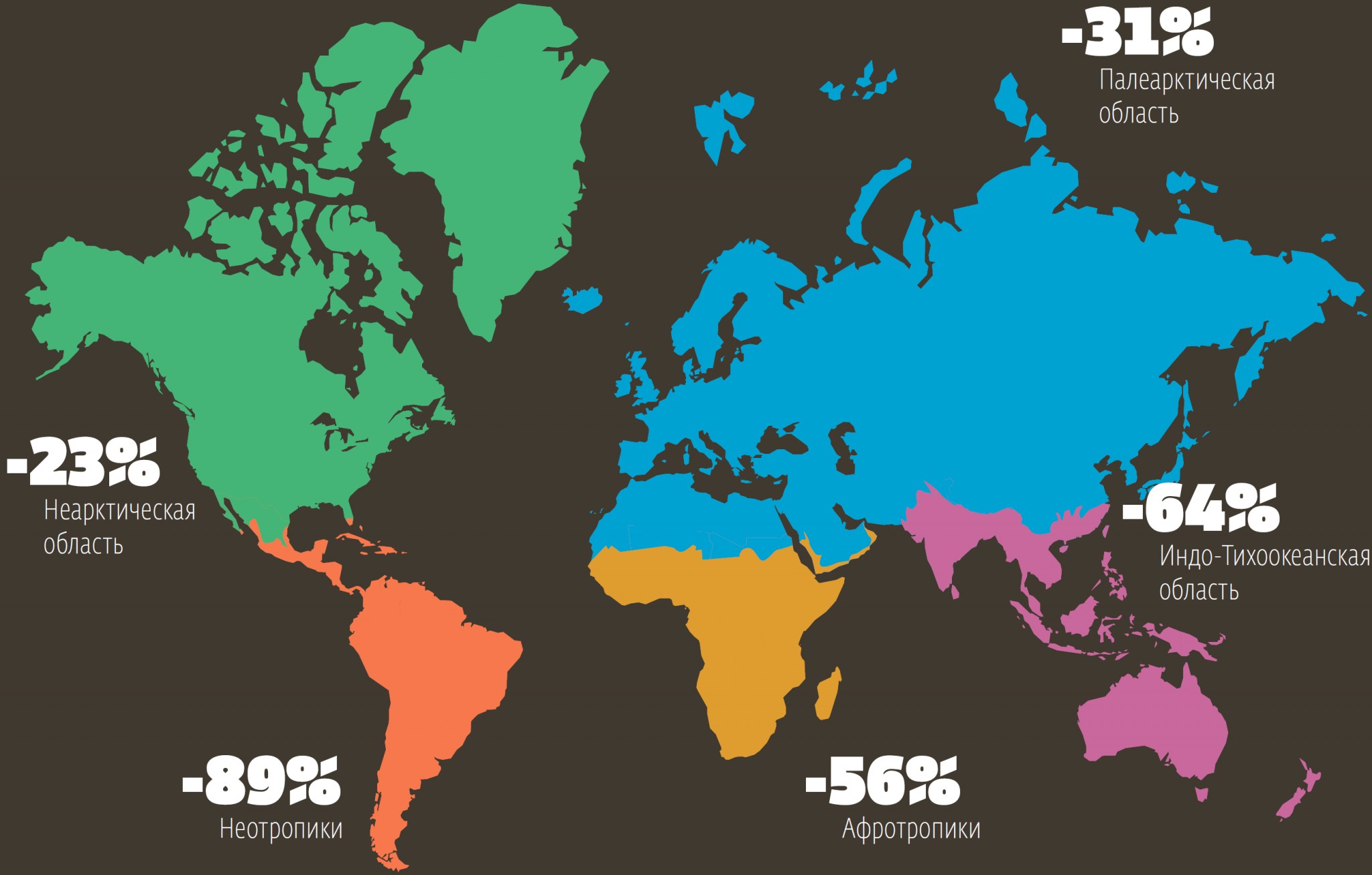 Сильнее всего пострадали животные в Южной и Центральной Америке, где популяции позвоночных сократились на 89%, прежде всего из-за вырубки лесов. А в целом по планете тяжелее всего приходится обитателям рек и озер — популяции живущих там диких видов сократились на 83%.