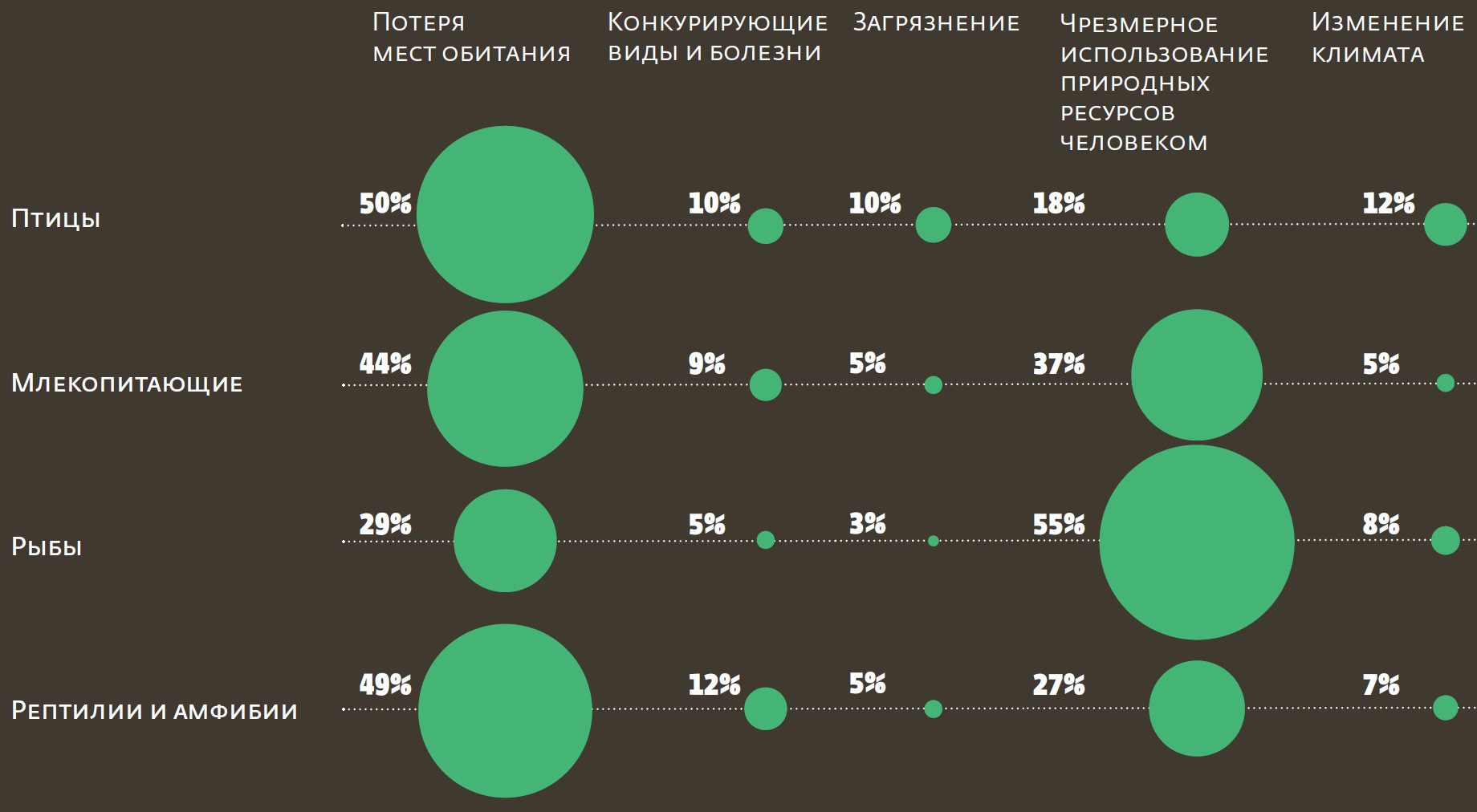 Ученые говорят о приходе шестой волны массового вымирания (предыдущая, пятая, уничтожила динозавров). Масштабы бедствия подсчитал Всемирный фонд дикой природы в докладе Living Planet Index. Популяции позвоночных животных — то есть млекопитающих, птиц, рыб, рептилий и земноводных — сократились в среднем по планете на 60% в период с 1970 по 2014 год.